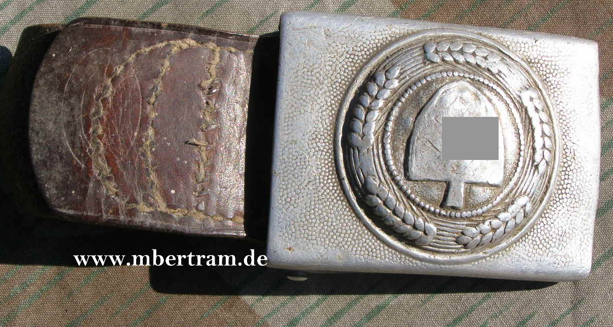 für MANNSCHAFTEN, DURCHGEPRÄGT, entnazifiziert. HK noch zu erkennen. Mit Lederlasche, Herstellerstempel sichtbar aber durch Tragung kaum noch lesbar.