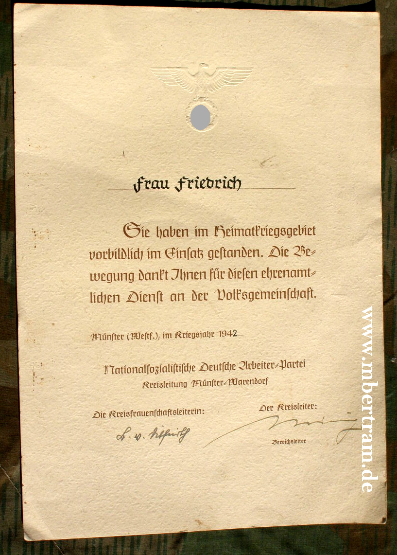 Kreis Münster / Warendorf für den vorbildlichen Einsatz im Heimatkriegsgebiet im Kriegsjahr 1942 für Frau Freidrich. Originalunterschriften Kreisfrauenschaftsleiterein und Kreisleiter.