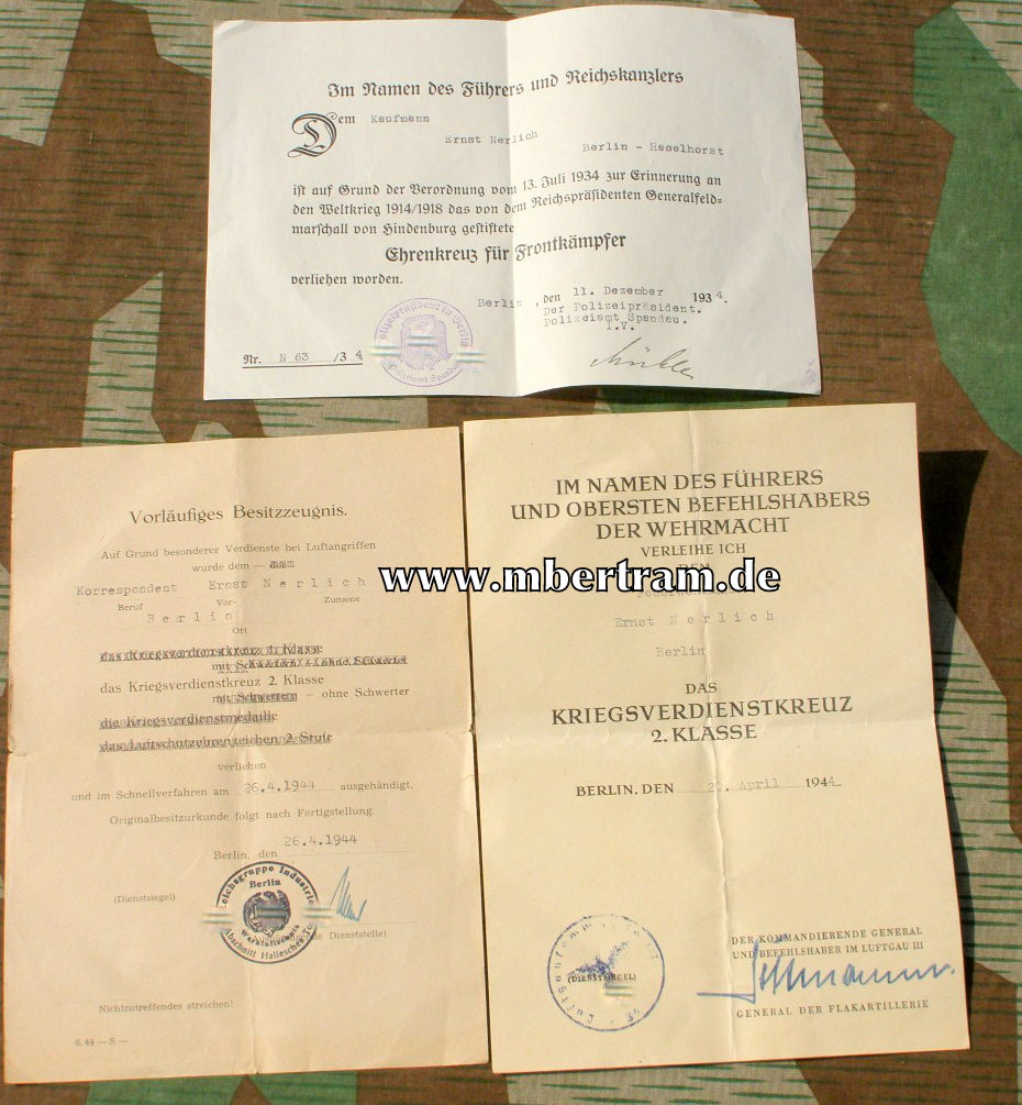 Ernst N. bestehend aus: 1.) sehr schönes, seltenes , vorläufiges Besitzzeugnis für das KvK 2.Kl. ohne Schwerter, beschriftet : " für den besonderen Verdienst bei Luftangriffen, Berlin 26.04.1944- wurde im " Schnellverfahren ausgehändigt " !!- Abgestempelt Reichsgruppe Industrie Berlin, Abschnitt Hallesches Tor, Werkluftschutz." 2.) Schön erhaltene Urkunde für das KvK 2.Kl. ohne Schwerter, beschriftet : "Berlin den 20. April 1944 , Unterschriftenstempel eines generals der Flakartillerie, Kdr. General Luftgau III, Stempel Luftgaukomando 3. 3.) Urkunde für das Ehrenkr. f. Fromntkämpfer, schöner Zustand. , Originalunterschrift Polizeipräsident Spandau.