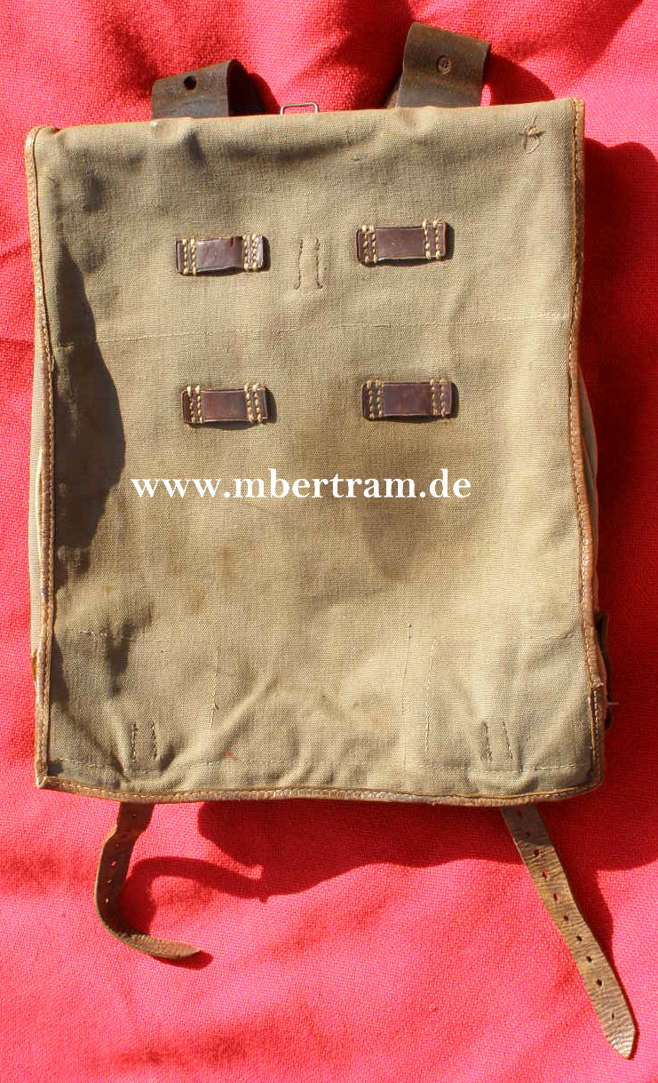 sogenannter " Affe" mit Truppenstempel/ Kammerstempel "L. Z.A.Breslau" bräunlicher Stoffrahmen. Lederberiemung noch gut erhalten, beweglich. Beide Riemen gestempelt mit Hersteller und Rgt Stempel. Ein Riemen mit : "5./J.R. 12 I ", " JR12 IIB" Hersteller ( unleserlich) und 1915, der andere mit: " Hst: "Stecher", Ort nicht ganz leserlich, 139 R. II. / JR 12, "5./J.R. 12 I " und Jahr 1916. Beide Riemen also mit gleichem Rgt. Stempel, also trotz der unterschiedlichen Jahrgänge ein so zusammen getragener und zusammengehöriger Tornister.