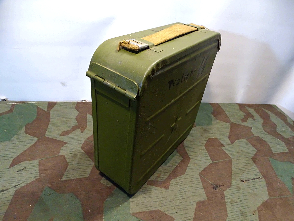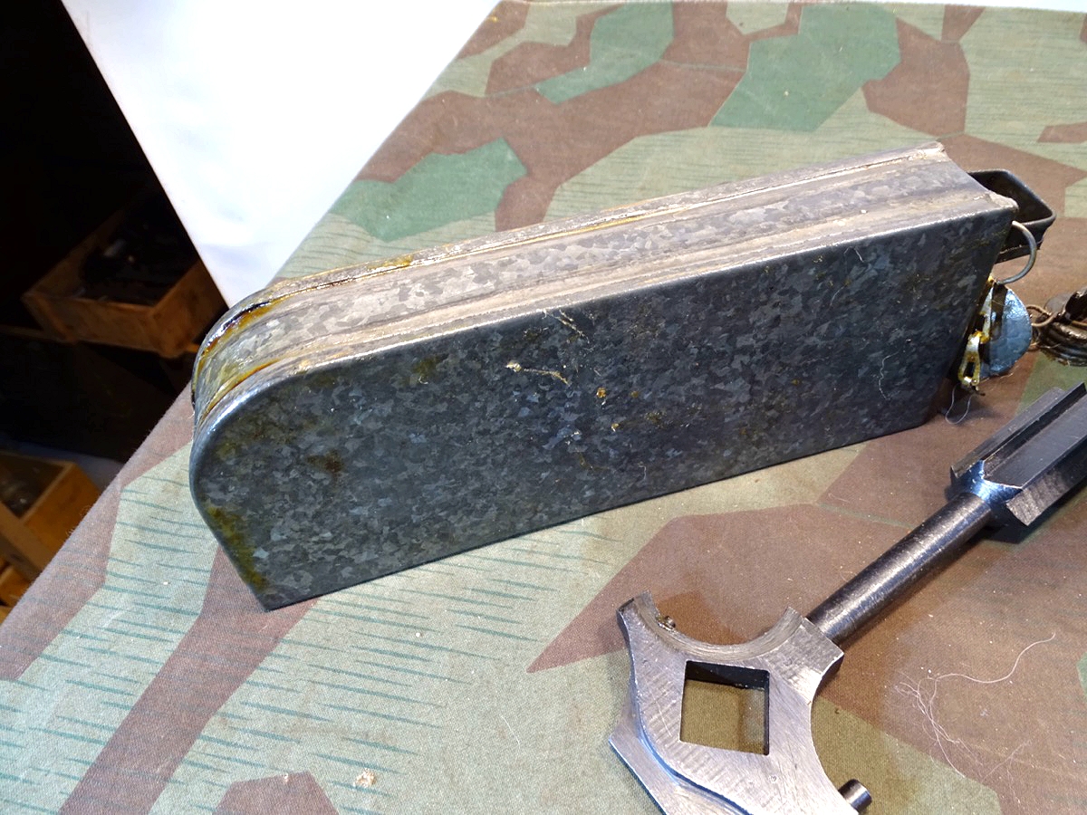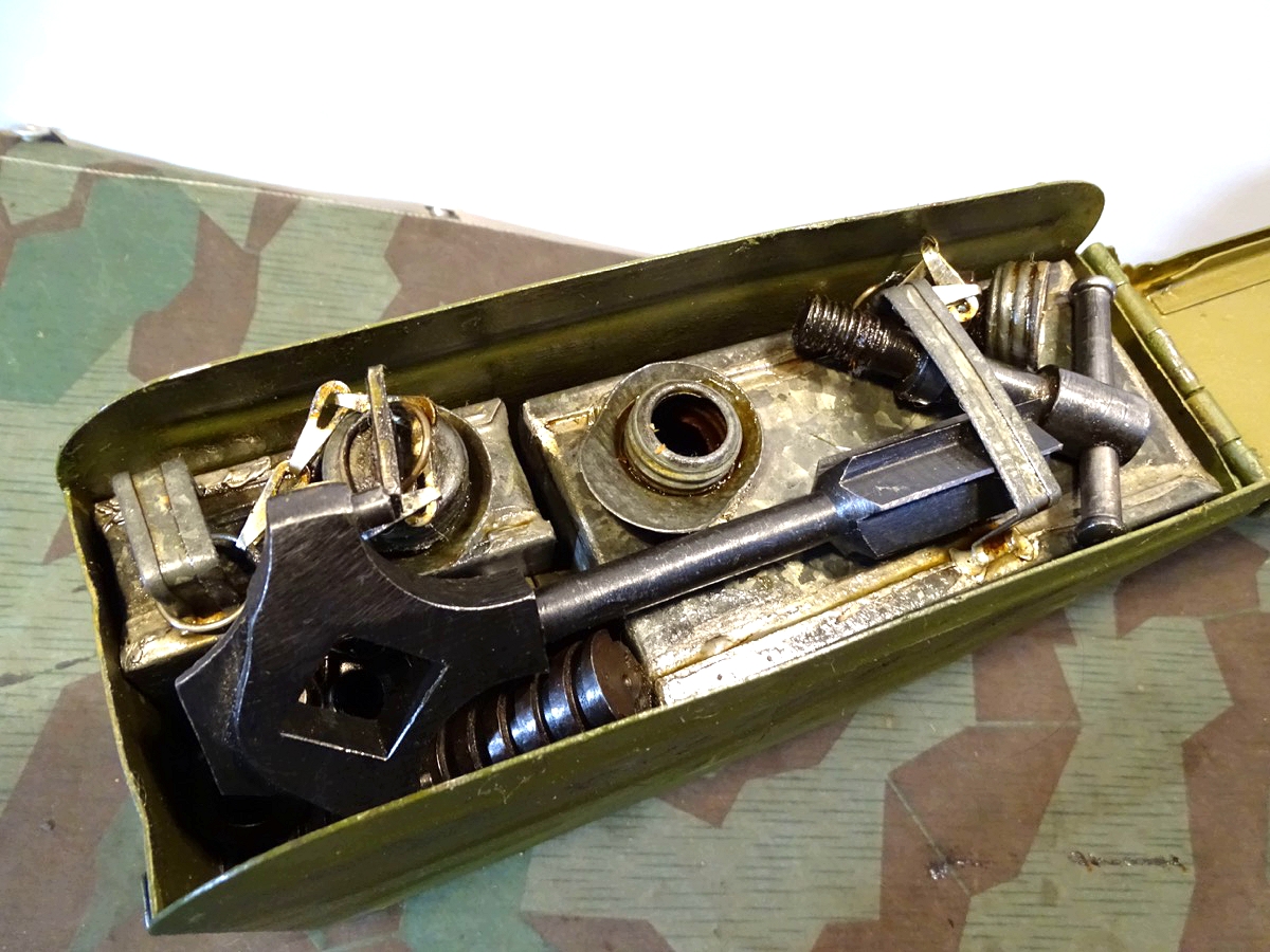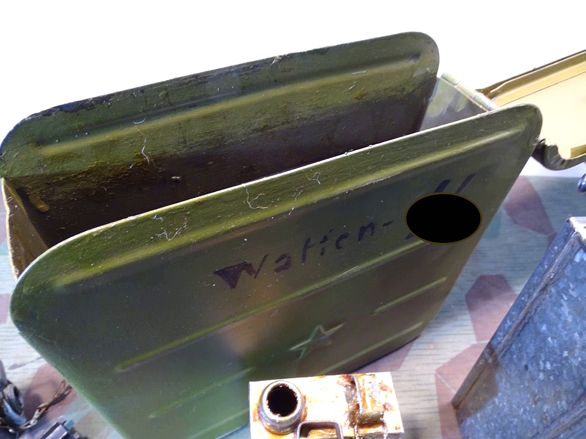 Relativ selten in diesem Umfang im Handel. Der Lafettenbolzen mit Schraube ist auch sein oft fehlendes und schwer zu bekommendes Ersstzteil. Ölkannen und Zubehör genau an den Innenraum des Gurtkastens angepasst. Zustand siehe Fotos. Der auf dem Kasten auflackierte Schriftzug Waffen SS ist sicherlich nachträglich aufgemalt worden. Die Farbe sieht sehr dünn aus, ich schätze man kann sie mit Verdünnung und Lappen oder verdünnung mit feinen Kunststoff Gewebe Schleifpadds bei Bedarf entfernen.
