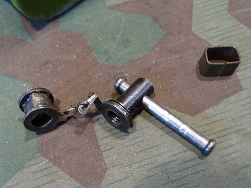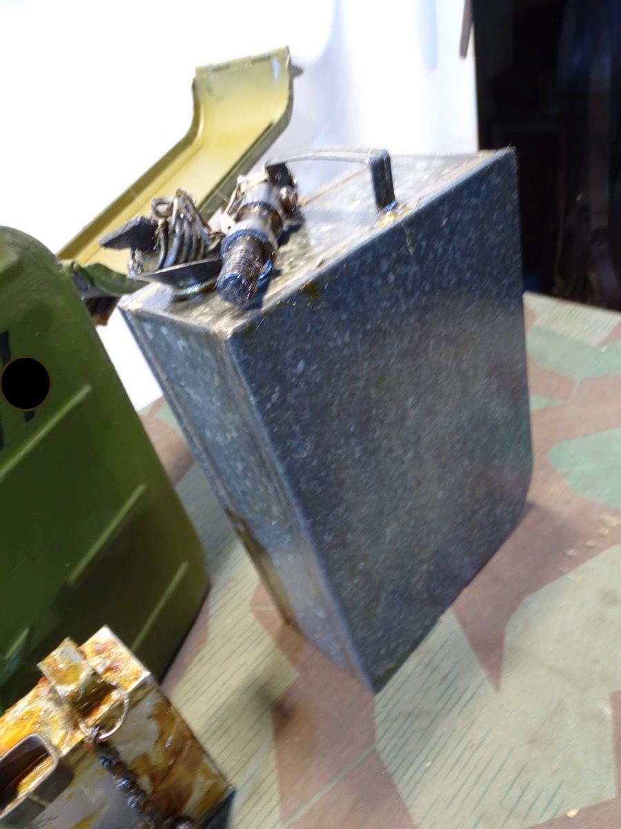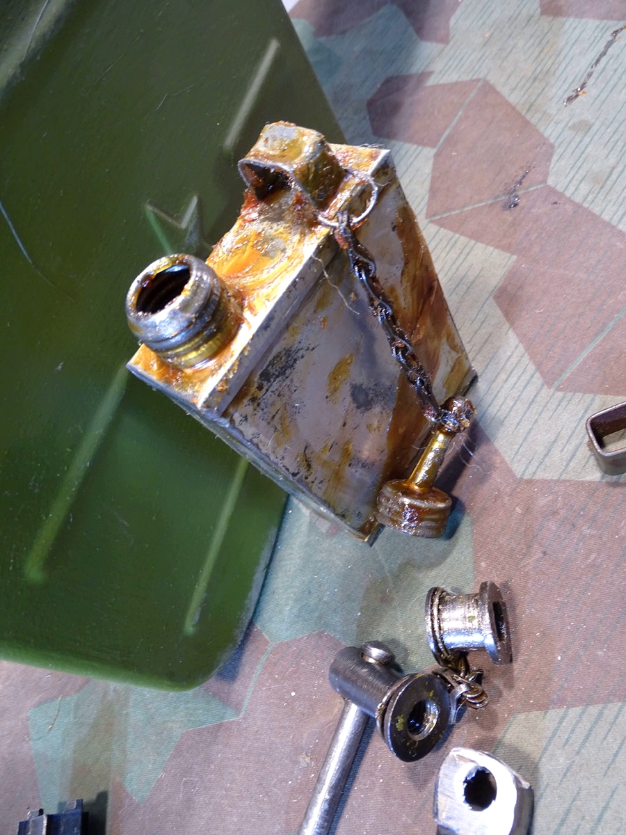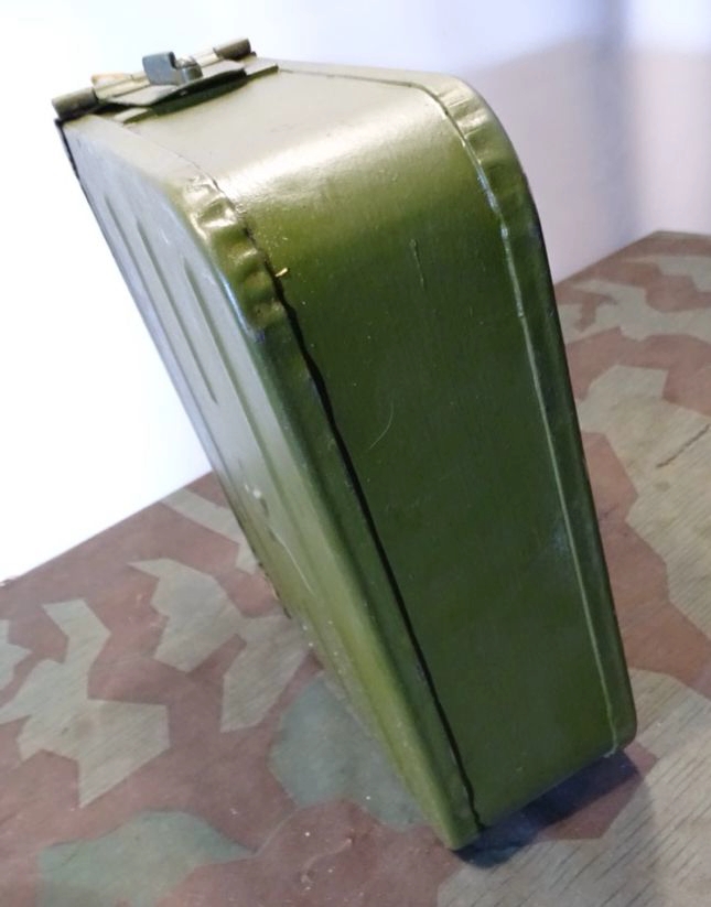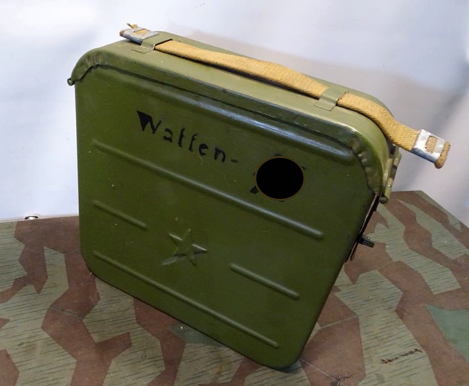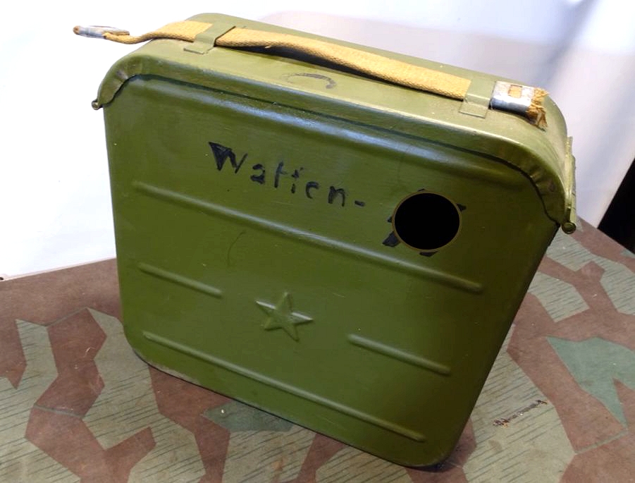 Relativ selten in diesem Umfang im Handel. Der Lafettenbolzen mit Schraube ist auch sein oft fehlendes und schwer zu bekommendes Ersstzteil. Ölkannen und Zubehör genau an den Innenraum des Gurtkastens angepasst. Zustand siehe Fotos. Der auf dem Kasten auflackierte Schriftzug Waffen SS ist sicherlich nachträglich aufgemalt worden. Die Farbe sieht sehr dünn aus, ich schätze man kann sie mit Verdünnung und Lappen oder verdünnung mit feinen Kunststoff Gewebe Schleifpadds bei Bedarf entfernen.