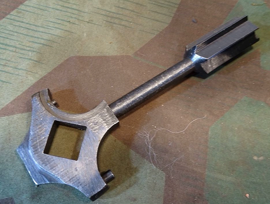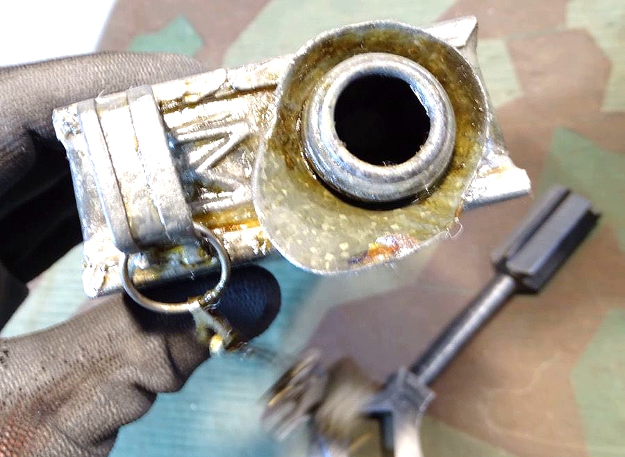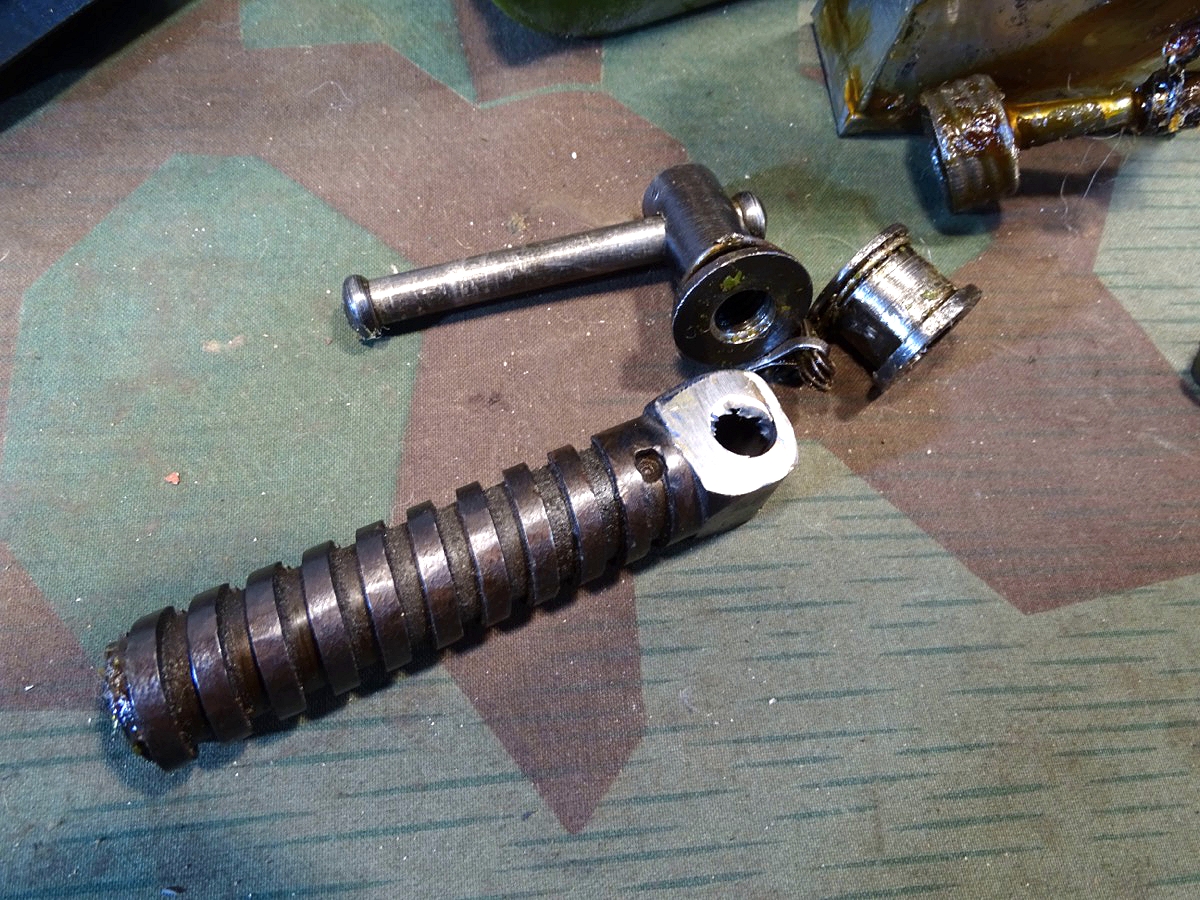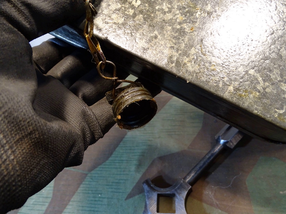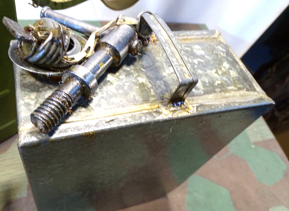 Relativ selten in diesem Umfang im Handel. Der Lafettenbolzen mit Schraube ist auch sein oft fehlendes und schwer zu bekommendes Ersstzteil. Ölkannen und Zubehör genau an den Innenraum des Gurtkastens angepasst. Zustand siehe Fotos. Der auf dem Kasten auflackierte Schriftzug Waffen SS ist sicherlich nachträglich aufgemalt worden. Die Farbe sieht sehr dünn aus, ich schätze man kann sie mit Verdünnung und Lappen oder verdünnung mit feinen Kunststoff Gewebe Schleifpadds bei Bedarf entfernen.
