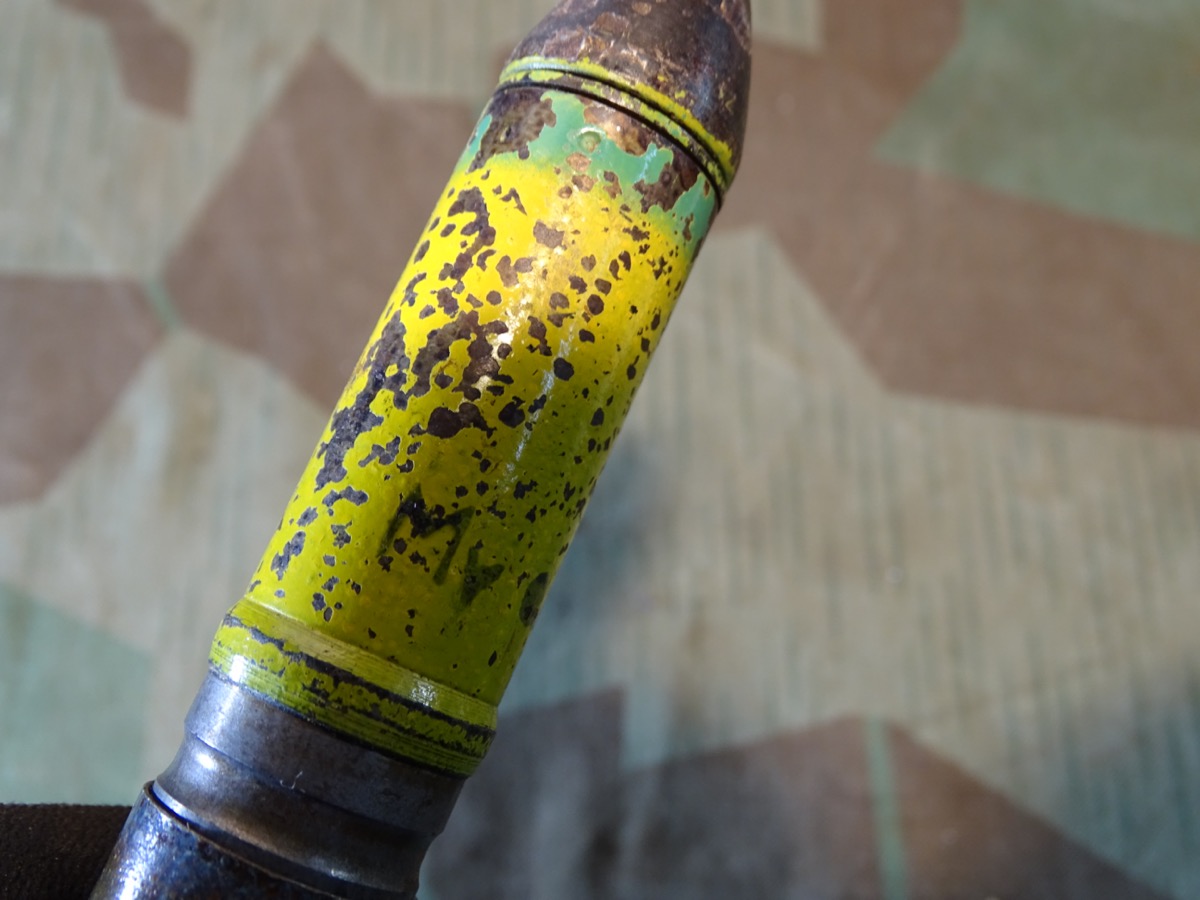 Kein Versand ins Ausland , NO Shipping to foreign countrys possible. 20mm Deko-Patrone, sie wurden bei der Luftwaffe aus der Maschinenkanone MG 151/20 verschossen. Hülse Eisen lackiert mit Sprenggranate und Zerlege-Zünder aus Eisen. Geschoss noch mit viel gelber Originalfarbe und - Beschriftung wie Code und 1944. Zünder mit Code efc, Hülsenboden auch mit Hersteller Code Stempel. Gewinde gängig. Zustand siehe Fotos. Die Patrone ist gem. KWKG abgeändert, komplett delaborioert, kein zündfähiges Matrial enthalten. Bei Bestellung bitte Altersnachweis mitsenden (Kopie vom Personalausweis).