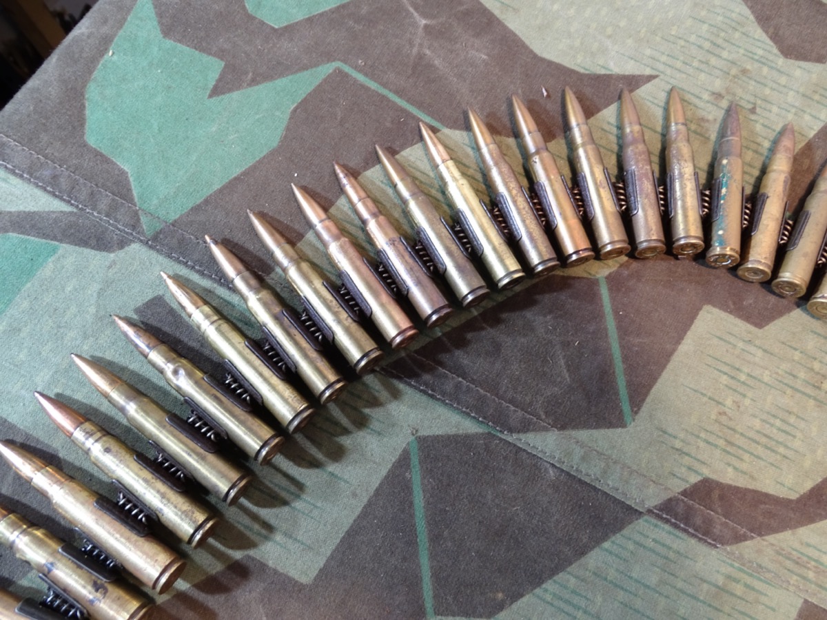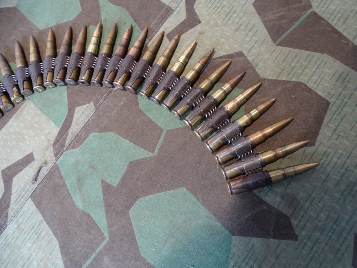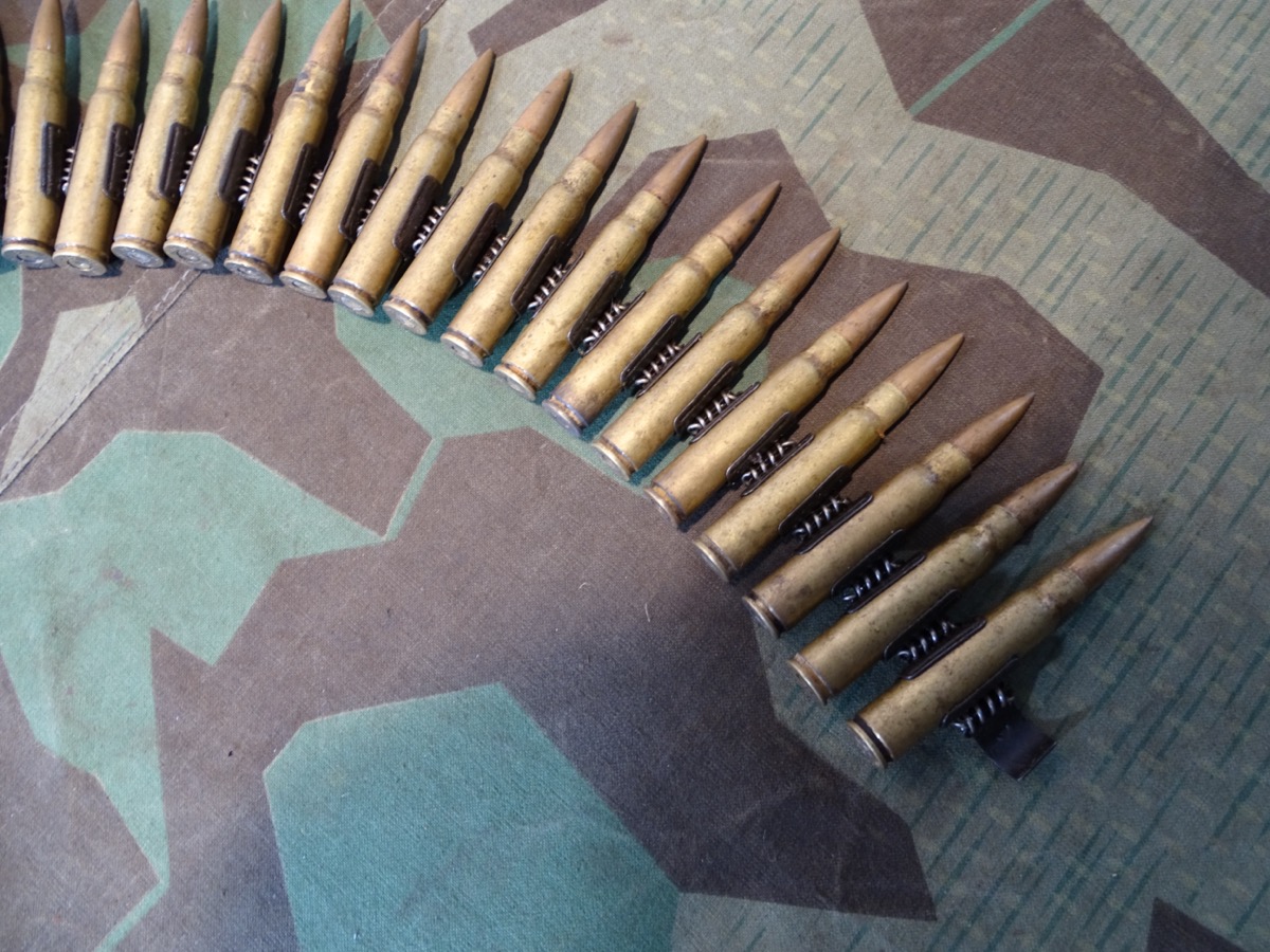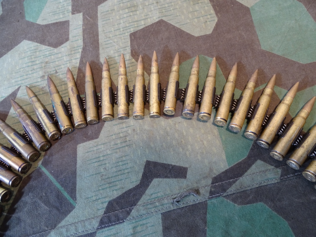 Kein Versand außerhalb Deutschlands , NO Shipping to foreign countrys possible. So im 2. Weltkrieg von der Wehrmacht verwendet. Patronen alle mit Buntmetallhülsen und gut erhaltenen Geschossen. Gleiches Erscheinungsbild. Vorwiegend frühe Hersteller, schöne gesmischte Sortierung um eine Auswahl von vielen Herstellern der 30er Jahre zu haben : P 25/38, P145/36, P249/38, P340/38, P 491/38, P131/38, P132/36, P 370/38 und 36, P25/35, P340/38, P163/39, P131/34. Würde so ideal zu einem MG 34 passen, die Messinghülsen wurden aber immer wieder eingesammelt und neu geladen, daher auch mit dem MG 42 so bis zum Kriegsende in Verwendung gewesen. Die 50er Gurtkette mit Herstellercodierung " adb 42" Gesetzeskonform, frei erwerbbar ab 18 Jahre. Komplett delaboriert, frei von zündfähigem Material. Zündplättchen abgeschlagen. Bei Bestellung bitte Altersnachweis senden oder mailen ( Kopie vom Personalausweis). Zustand siehe Fotos