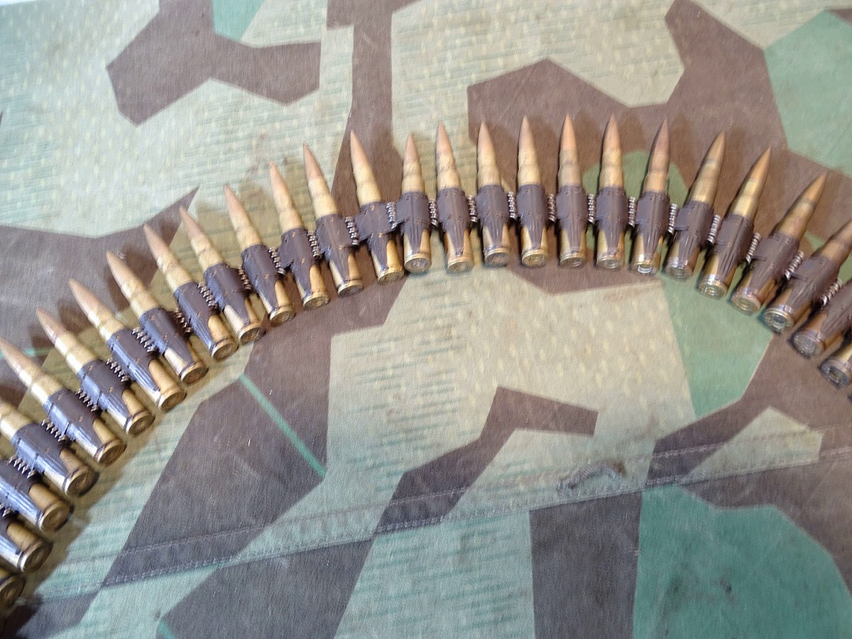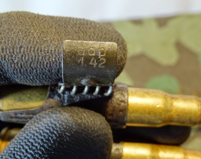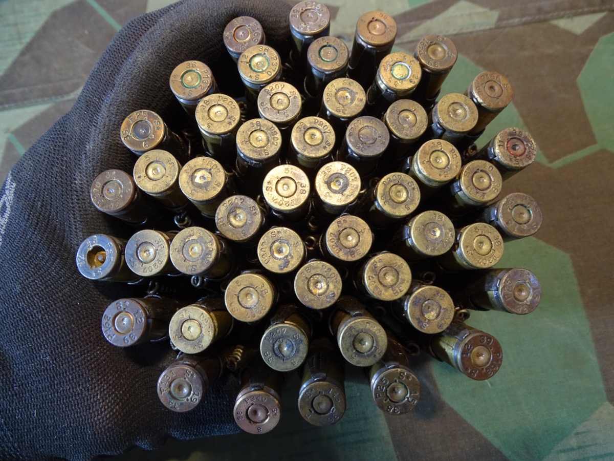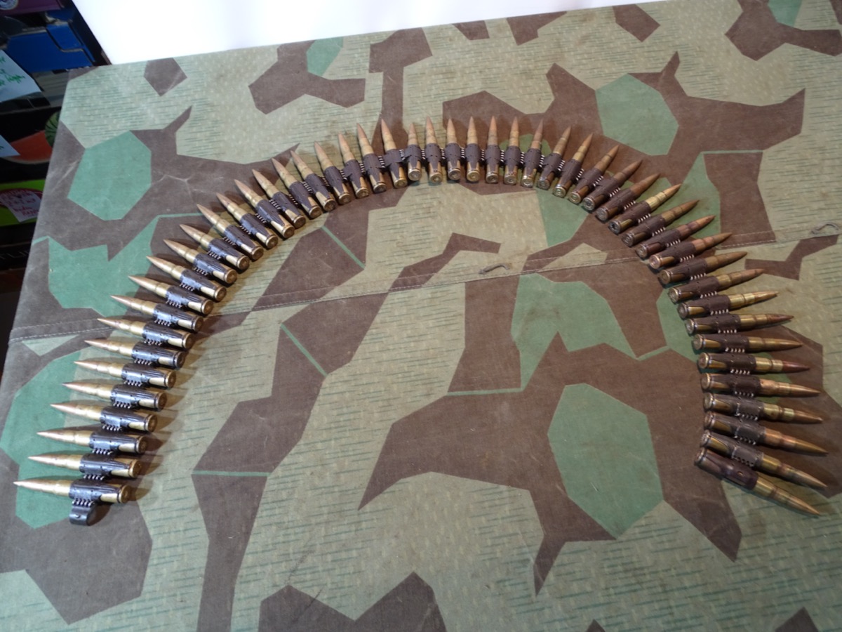 Kein Versand außerhalb Deutschlands , NO Shipping to foreign countrys possible. So im 2. Weltkrieg von der Wehrmacht verwendet. Patronen alle mit Buntmetallhülsen und gut erhaltenen Geschossen. Gleiches Erscheinungsbild. Vorwiegend frühe Hersteller, schöne gesmischte Sortierung um eine Auswahl von vielen Herstellern der 30er Jahre zu haben : P 25/38, P145/36, P249/38, P340/38, P 491/38, P131/38, P132/36, P 370/38 und 36, P25/35, P340/38, P163/39, P131/34. Würde so ideal zu einem MG 34 passen, die Messinghülsen wurden aber immer wieder eingesammelt und neu geladen, daher auch mit dem MG 42 so bis zum Kriegsende in Verwendung gewesen. Die 50er Gurtkette mit Herstellercodierung " adb 42" Gesetzeskonform, frei erwerbbar ab 18 Jahre. Komplett delaboriert, frei von zündfähigem Material. Zündplättchen abgeschlagen. Bei Bestellung bitte Altersnachweis senden oder mailen ( Kopie vom Personalausweis). Zustand siehe Fotos