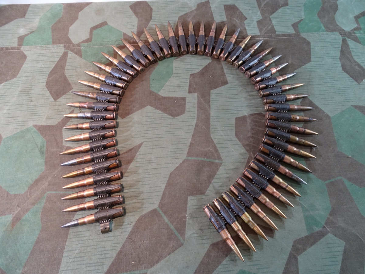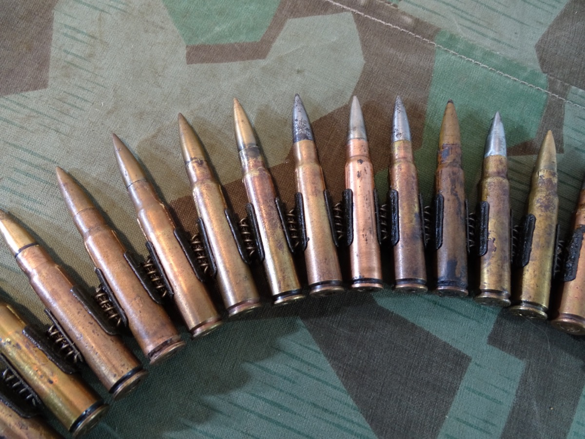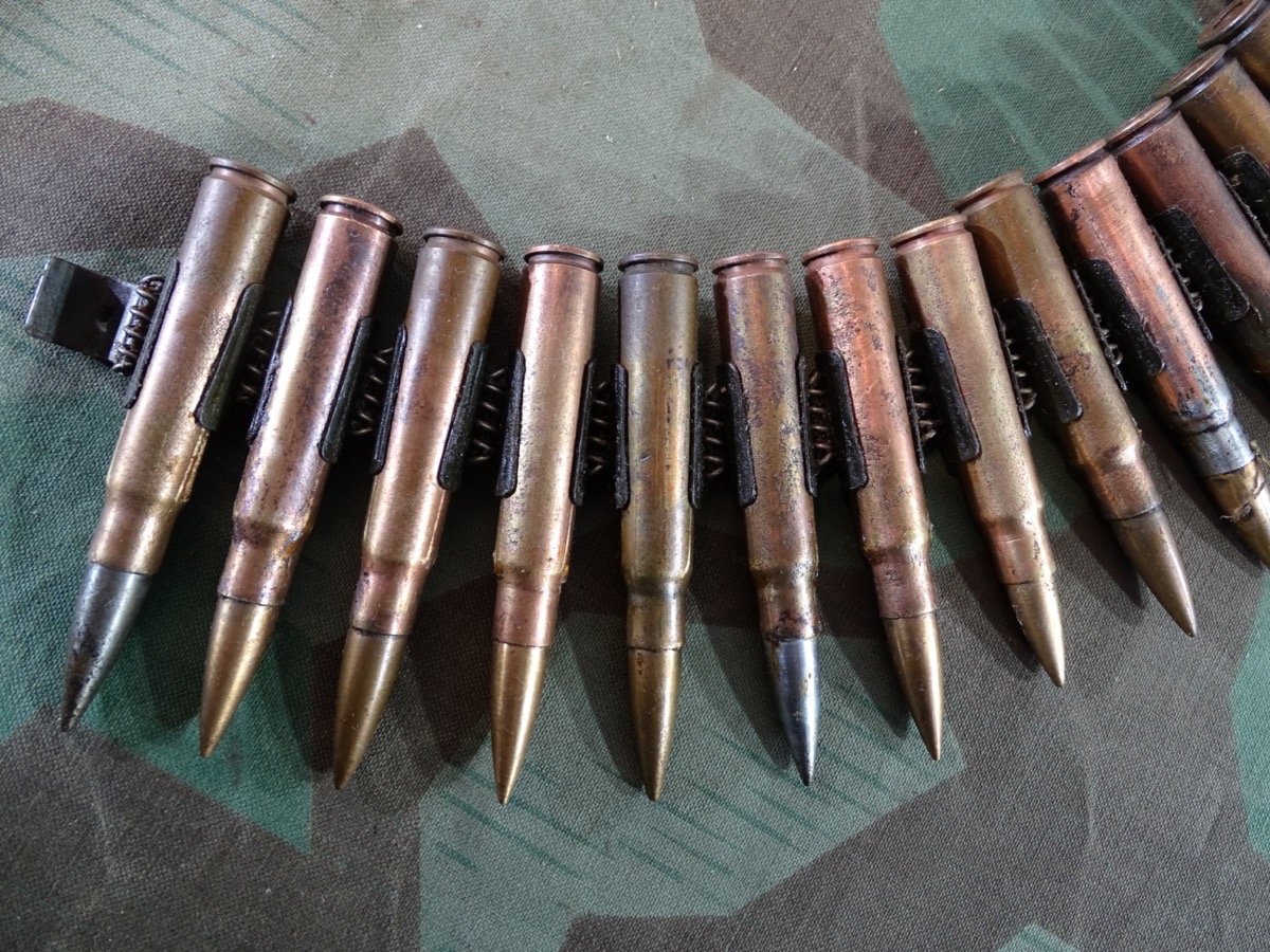 Kein Versand außerhalb Deutschlands , NO Shipping to foreign countrys possible. So im 2. Weltkrieg von der Wehrmacht verwendet. Patronen vorwiegend mit Buntmetallhülsen. Gleiches Erscheinungsbild. Verschiedene Hersteller, die Mehrzahl der Patronen von P 340/38. ( 1938) Gurtkette Herstellercodierung der bekannten Wuppertaler Firma Stocko " cvo" Ein Großteil aller Druckknöpfe und Reisverschlüsse der Wehrmacht wurde von der Fa. Stocko gefertigt- interessant zu sehen, daß Sie auch Waffenzubehör gefertigt haben. Gesetzeskonform, frei erwerbbar ab 18 Jahre. Komplett delaboriert, frei von zündfähigem Material. Zündplättchen abgeschlagen. Bei Bestellung bitte Altersnachweis senden oder mailen ( Kopie vom Personalausweis). Zustand siehe Fotos