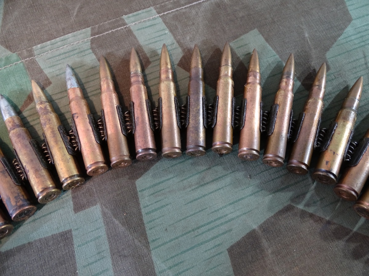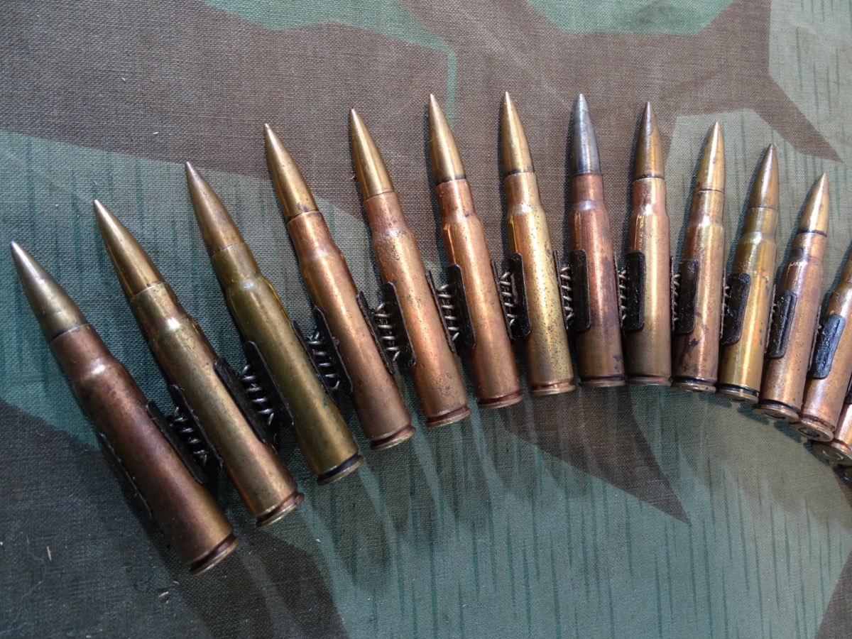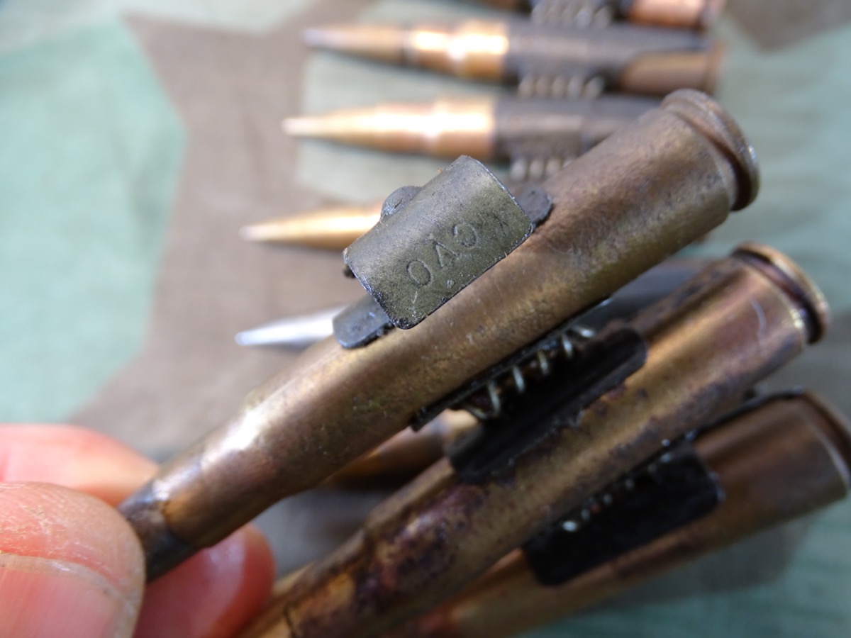 Kein Versand außerhalb Deutschlands , NO Shipping to foreign countrys possible. So im 2. Weltkrieg von der Wehrmacht verwendet. Patronen vorwiegend mit Buntmetallhülsen. Gleiches Erscheinungsbild. Verschiedene Hersteller, die Mehrzahl der Patronen von P 340/38. ( 1938) Gurtkette Herstellercodierung der bekannten Wuppertaler Firma Stocko " cvo" Ein Großteil aller Druckknöpfe und Reisverschlüsse der Wehrmacht wurde von der Fa. Stocko gefertigt- interessant zu sehen, daß Sie auch Waffenzubehör gefertigt haben. Gesetzeskonform, frei erwerbbar ab 18 Jahre. Komplett delaboriert, frei von zündfähigem Material. Zündplättchen abgeschlagen. Bei Bestellung bitte Altersnachweis senden oder mailen ( Kopie vom Personalausweis). Zustand siehe Fotos