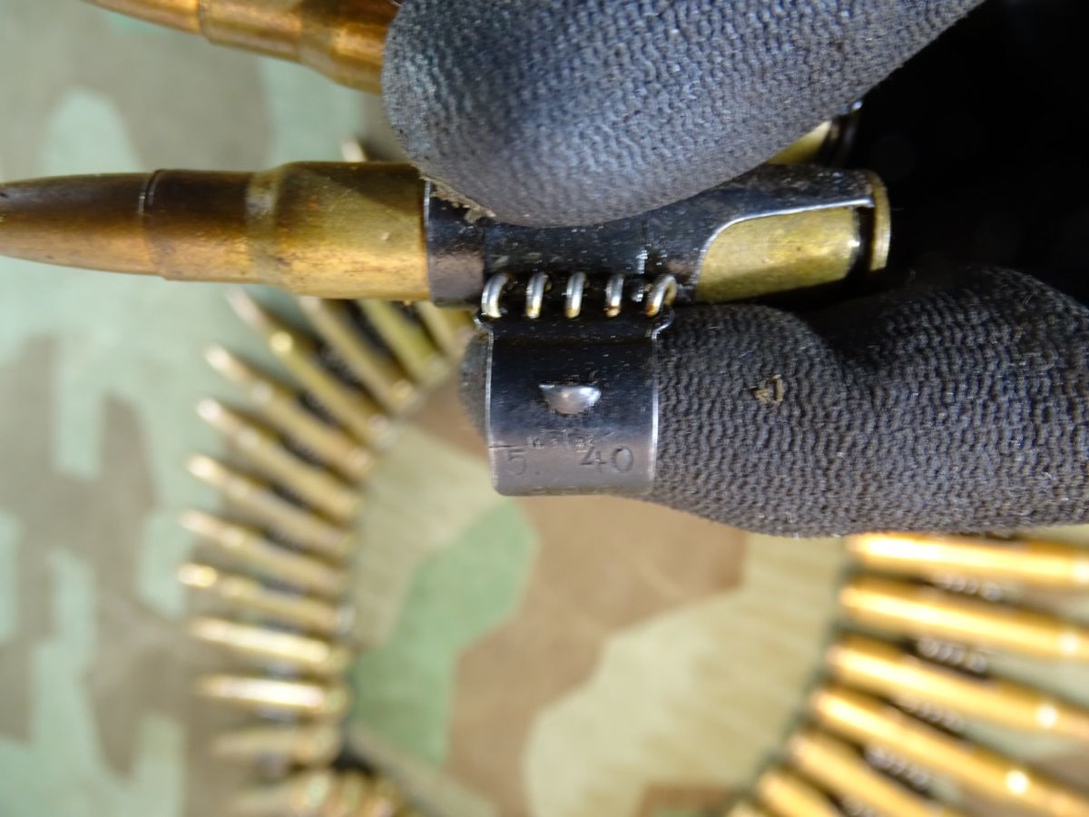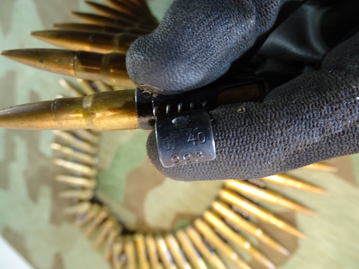 Kein Versand außerhalb Deutschlands , NO Shipping to foreign countrys possible. Komplett sehr schöner Zustand und alle Patronen vom gleichen Hersteller, sozusagen Nummerngleich. So im 2. Weltkrieg von der Wehrmacht verwendet. Patronen alle mit Buntmetallhülsen und sehr gut erhaltenen Geschossen. Alle gleiches Erscheinungsbild. Hersteller: P 69 1936. .50er Gurtkette mit früher Nummern Herstellercodierung 993 von 05.1940 mkit WaA Abnahme. Gesetzeskonform, frei erwerbbar ab 18 Jahre. Komplett delaboriert, frei von zündfähigem Material. Zündplättchen abgeschlagen. Bei Bestellung bitte Altersnachweis senden oder mailen ( Kopie vom Personalausweis). Zustand siehe Fotos