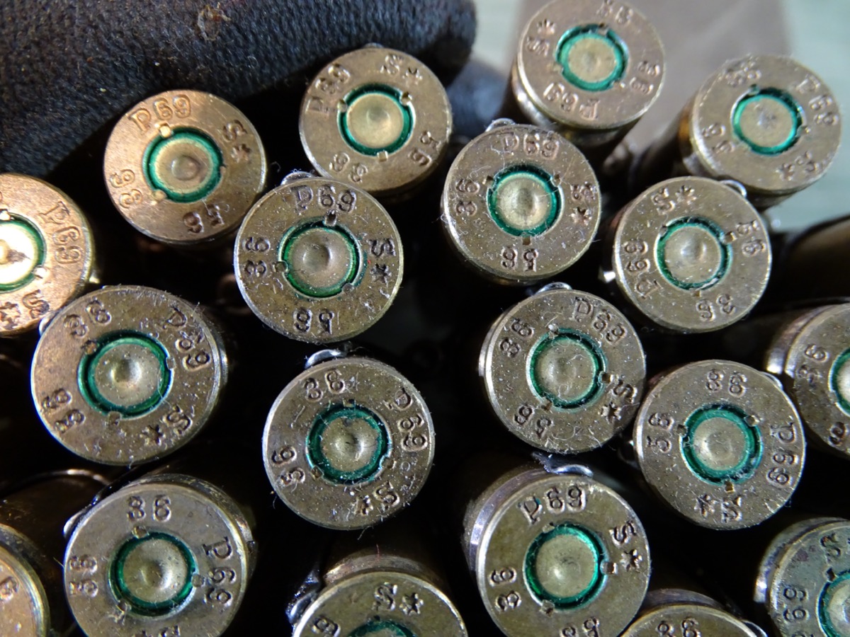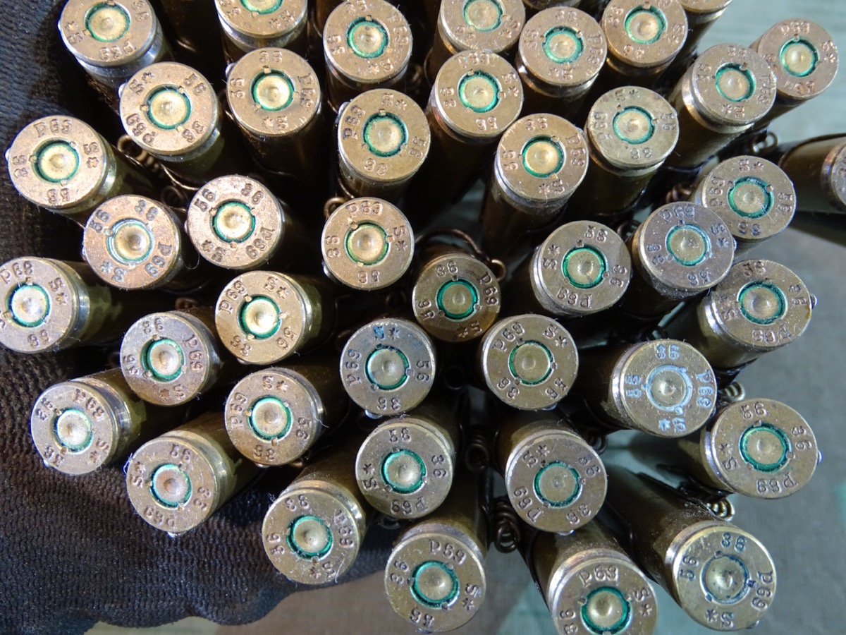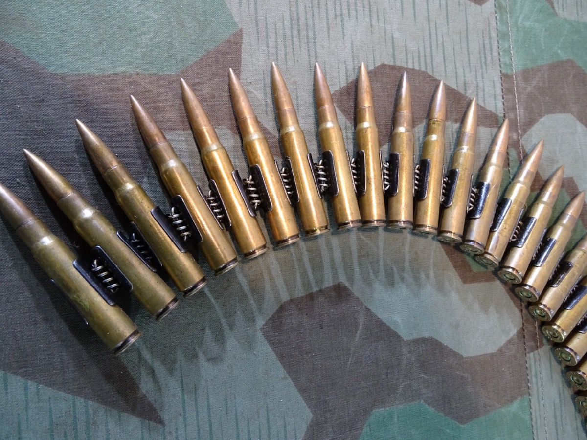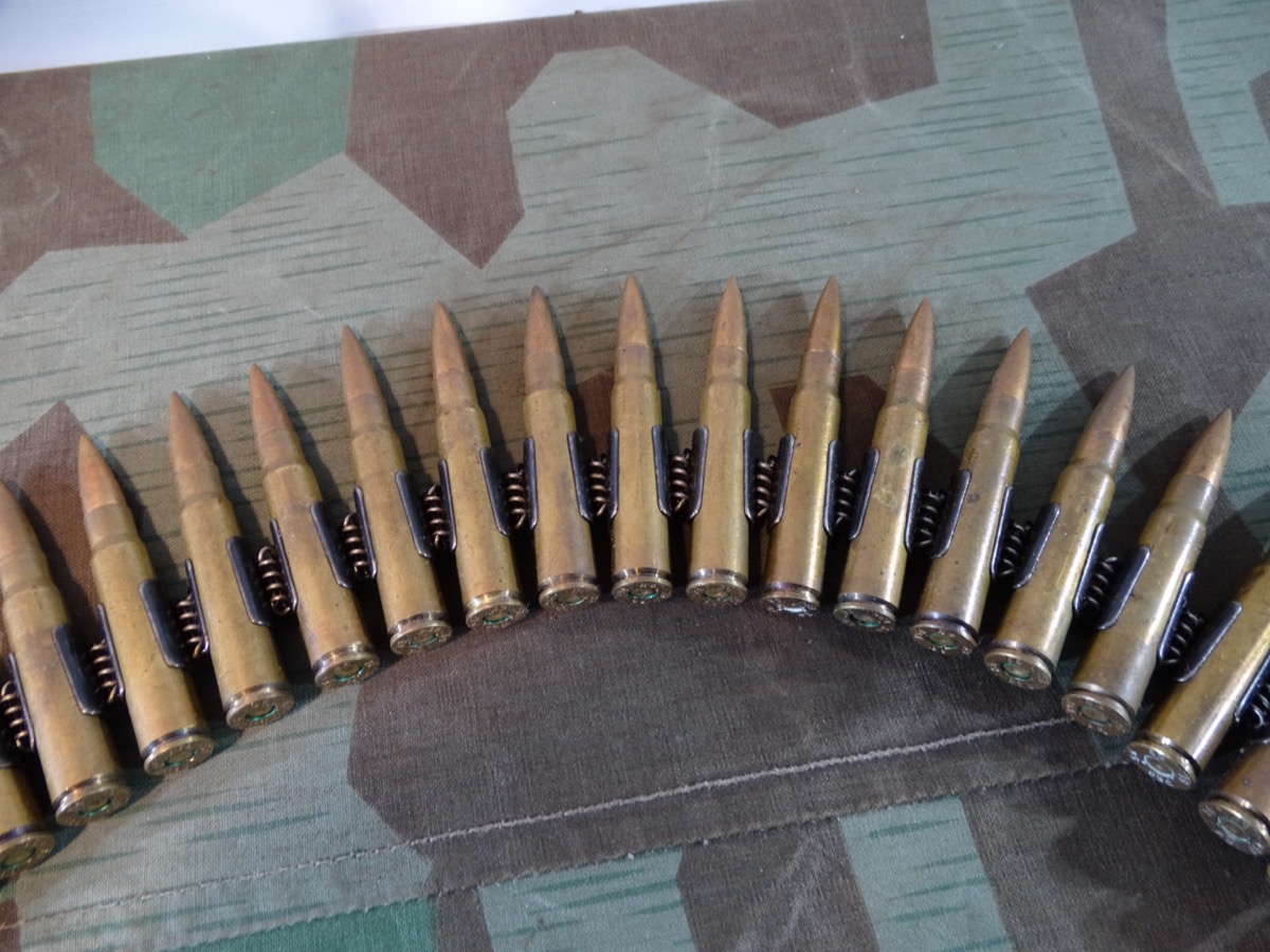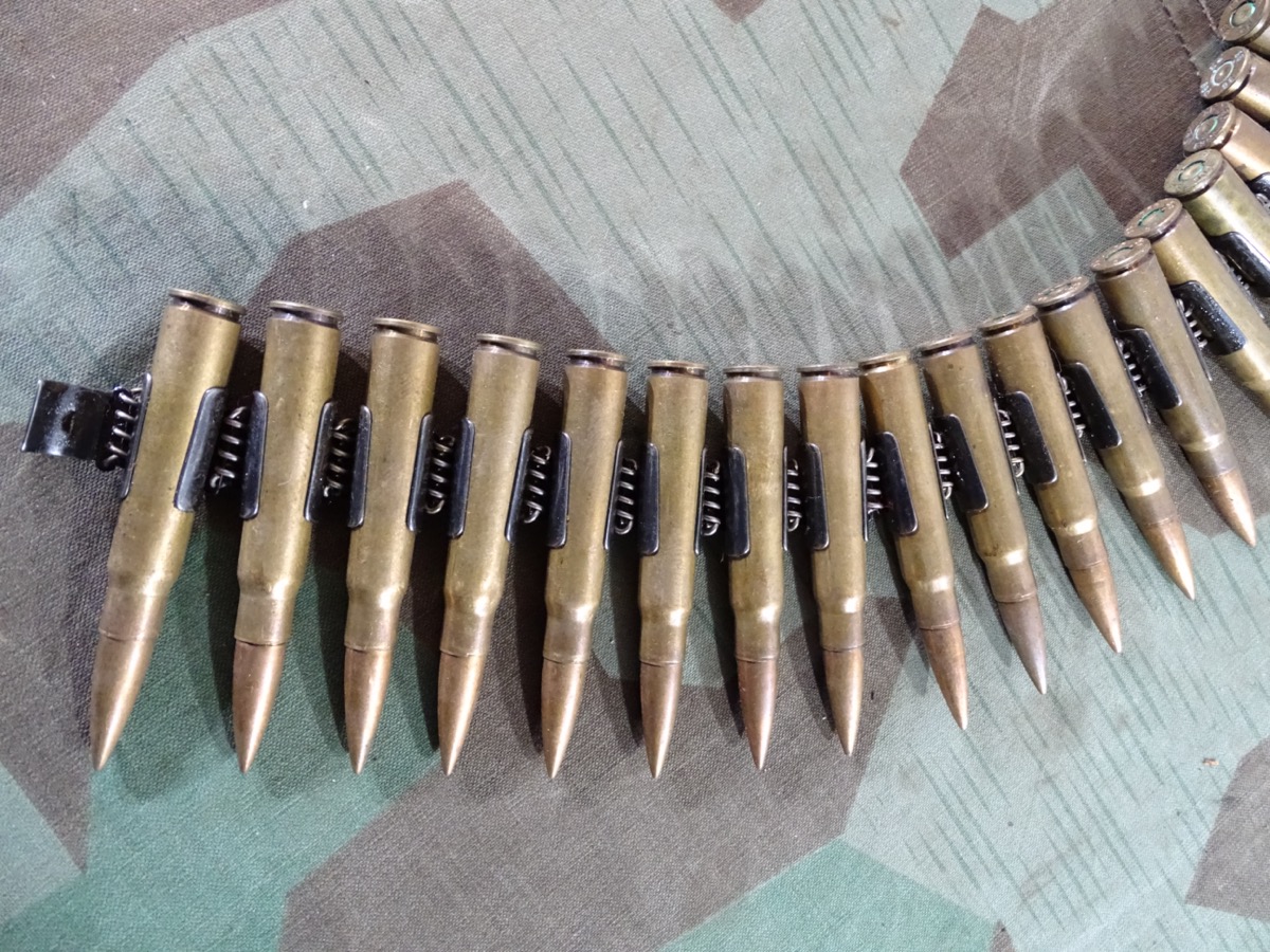 Produktinformationen "Wehrmachts Patronengurt / Gurtkette mit 50 gleichen Buntmetall Deko Patronen 8x57, P69 1936"