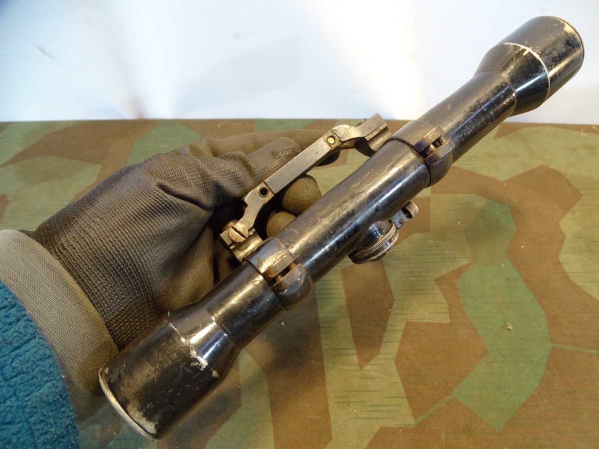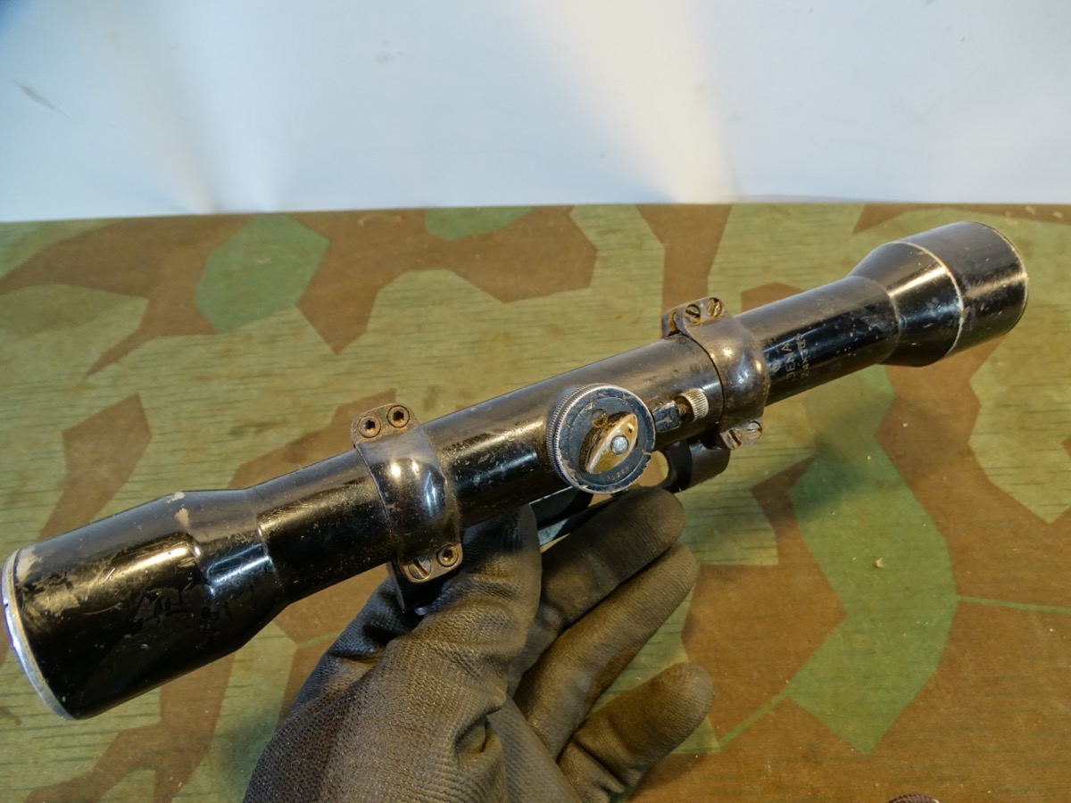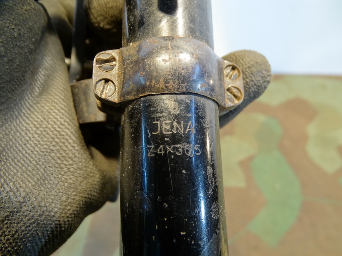 Aus einer Sammlungsauflösung. Vom Vorbesitzer wohl als Ersatz für ein Wehrmachts Scharfschützen Glas in die Sammlung gelegt worden. Ob der Bezug alt ist oder vom Vorbesitzer selbst gefertigt wurde können wir nicht sagen. Durchsicht klar, Zielmarkierung gut sichtbar. Aluminiumgehäuse., Auf Montage mit Stempel Akah, Auf Glas mit " Jena Z 4x 30,5. Wohl ein frühes Nachkriegszielfernrohr aus Jena. "Z4" ist dabei ein Wortspiel in Anspielung auf das Zielvier der Zeit vor 1945.