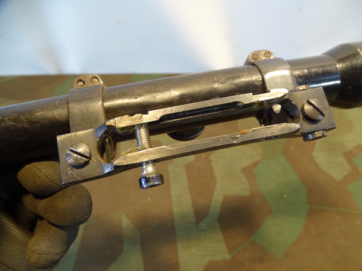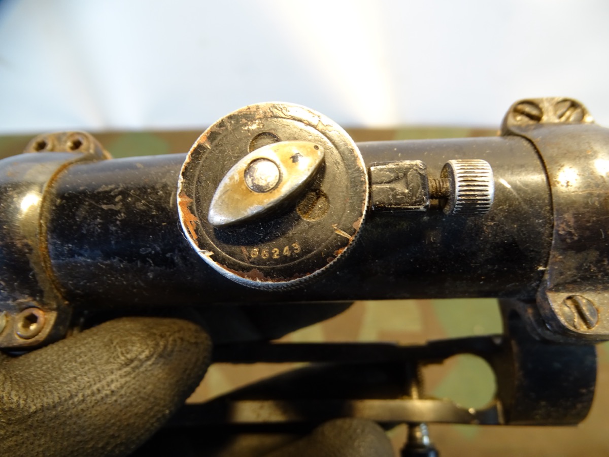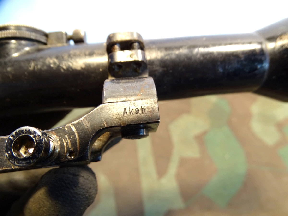 Aus einer Sammlungsauflösung. Vom Vorbesitzer wohl als Ersatz für ein Wehrmachts Scharfschützen Glas in die Sammlung gelegt worden. Ob der Bezug alt ist oder vom Vorbesitzer selbst gefertigt wurde können wir nicht sagen. Durchsicht klar, Zielmarkierung gut sichtbar. Aluminiumgehäuse., Auf Montage mit Stempel Akah, Auf Glas mit " Jena Z 4x 30,5. Wohl ein frühes Nachkriegszielfernrohr aus Jena. "Z4" ist dabei ein Wortspiel in Anspielung auf das Zielvier der Zeit vor 1945.