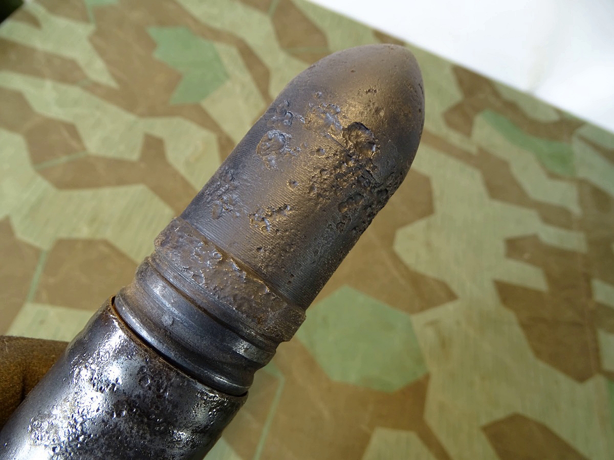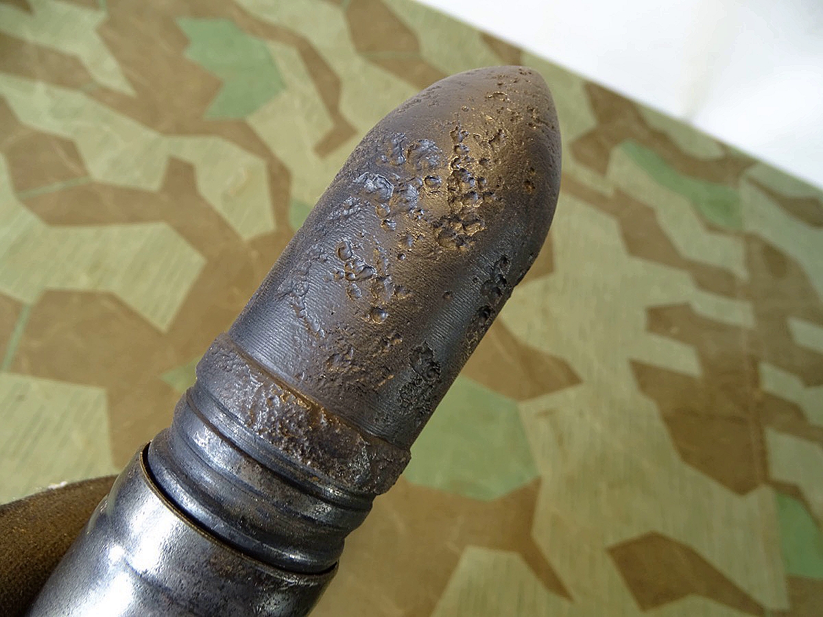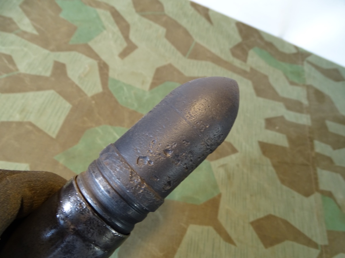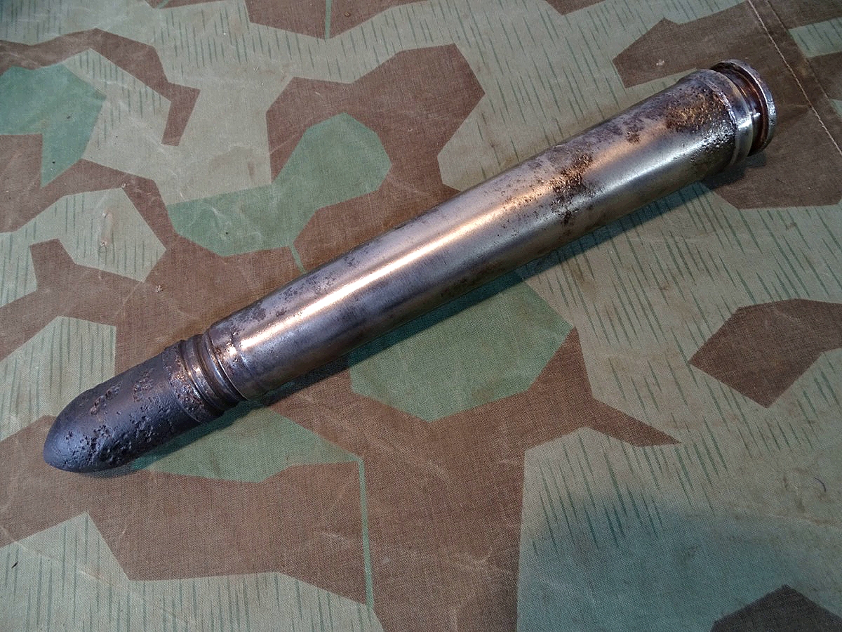 Kein Versand ins Ausland, no shipping to foreing countries. Panzer Gechoss gereinigt und schwarz lackiert. Stahhülse gereinigt und mit Klarlack gegen Rost geschützt. Oberfläche etwas narbig aber ohne Löcher. Leichter Messingglanz, die Hülse war wahrscheinlich vermessingt. Bodenstempel noch leserlich erhalten. Herstellercode wa mit schönem WaA Adler mit HK , Schrift-Flak 18 und Jahreszahl 1943.