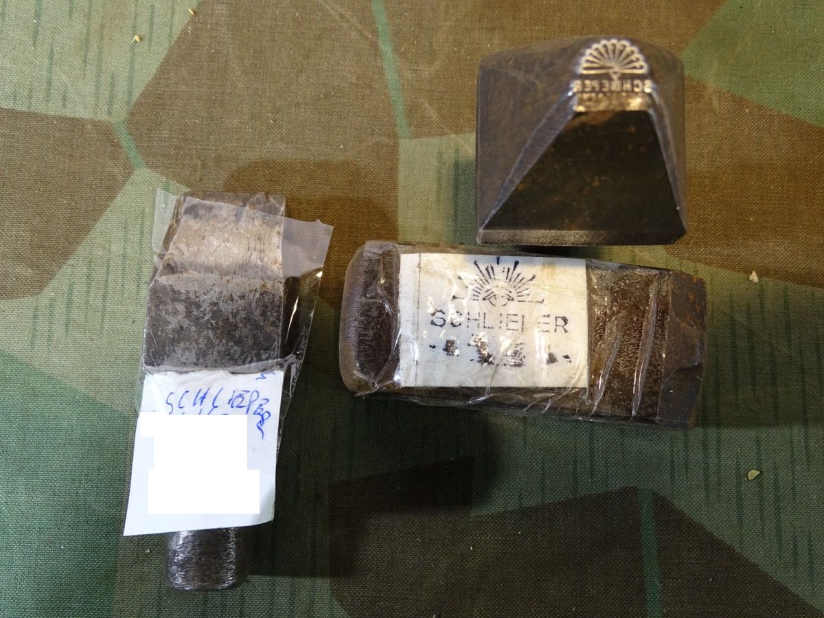 Die Fa. Schlieper stellte im 3 Reich z.B. auch SA Dolche und HJ Dolche her. 3 etwas variiernede Größen und Ausführungen für verschiedene Produkte. Stempelbilder Höhe: Lange Schlieper Schrift mit Logo rechts daneben ca. 6mm, großer Stempel mit Logo über Schrift Schlieper ca. 15,5 mm H, kleiner Stempel mit Logo über Schrift Schlieper ca. 8,4 mm H. Aus der Firmenauflösung eines Solinger Zuliefer Betriebes der Fa. Schlieper. Zulieferer verfügten oft über zusätzliche Firmenstempel , da sie die Ware auch nach dem Bearbeitungsschritt für die Blankwaffenfirmen kennzeichneten. In Matrial, Metall, Form und Ausführung zeitgenössiche Originale. Da die Fa. bis heute besteht ist es nicht ganz eindeutig ob die Stempel vor 1945 gefertigt wurden oder in den 50ern. Es ist hier als Grundmaterial kein moderner Stempelrohling einer heutigen Stempelfirma verwendet worden, sondern ein für die Zeit typisches vierkannt Eisen, am Hinterstück mit Aufnahme in eine Stemplel Presse. Das Stempelbild ist unserer Meinung nach handgestochen wie damals üblich.