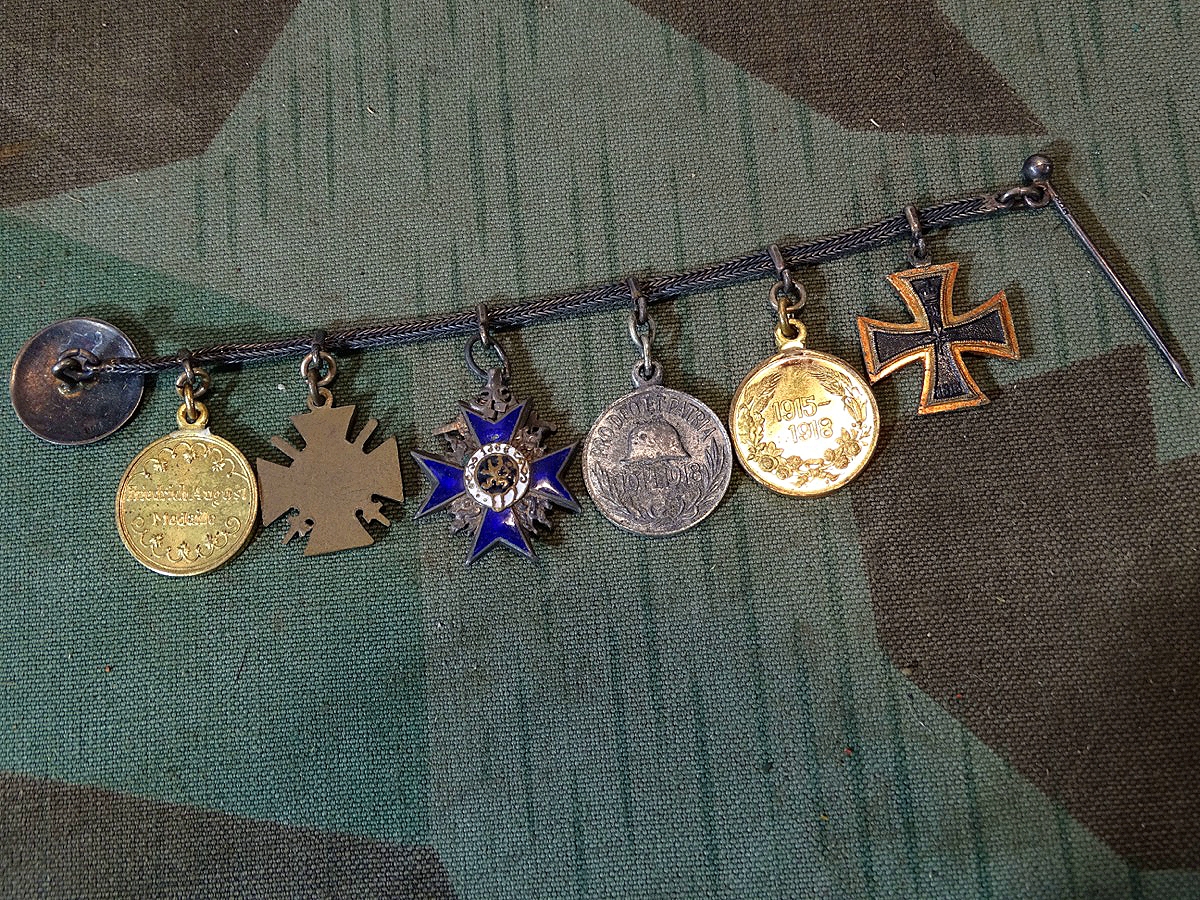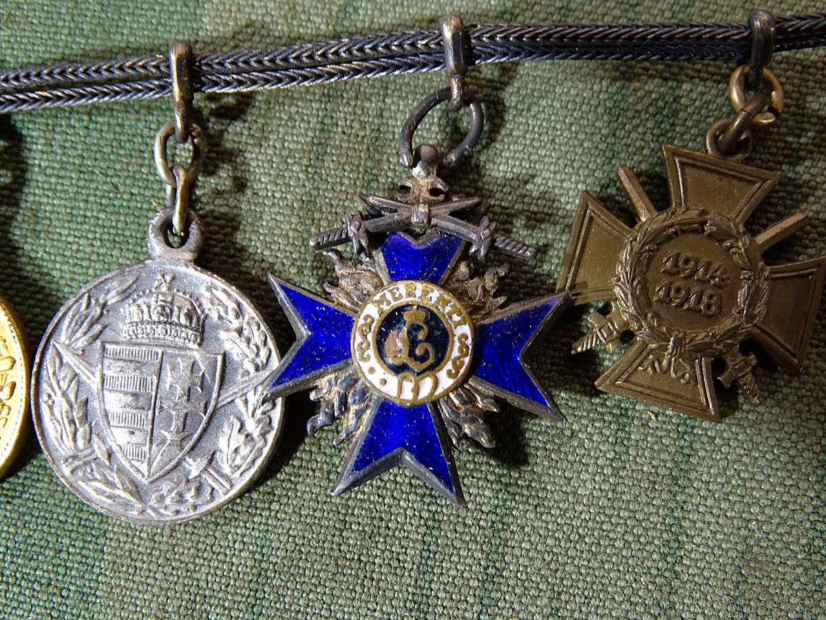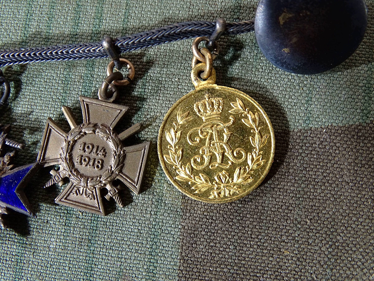Zustand siehe Fotos, Kettchenknopf mit 900er Silberstempel. Eisernes Kreuz 2 Klasse 1914, Österreich-Bulgarische Kriegsdenkmünze 1915-1918, Österreich-Ungarische Militärverdienst Medaille 1914-1918" "Pro Deo et Partia" , BAYERN - MILITÄR-VERDIENSTORDEN 4.KLASSE MIT SCHWERTERN, Ehrenkreuz für Frontkämpfer 1914-18, Friedrich August Medaille