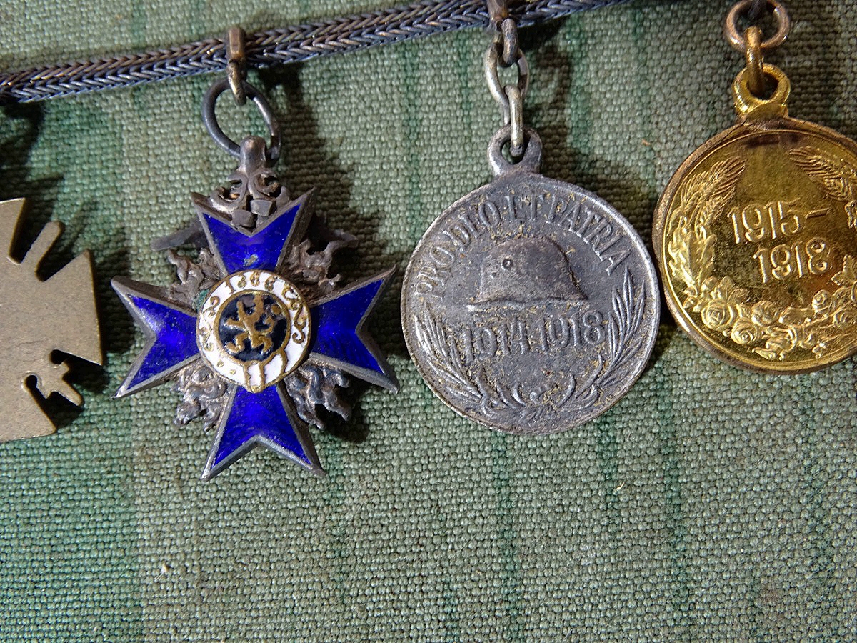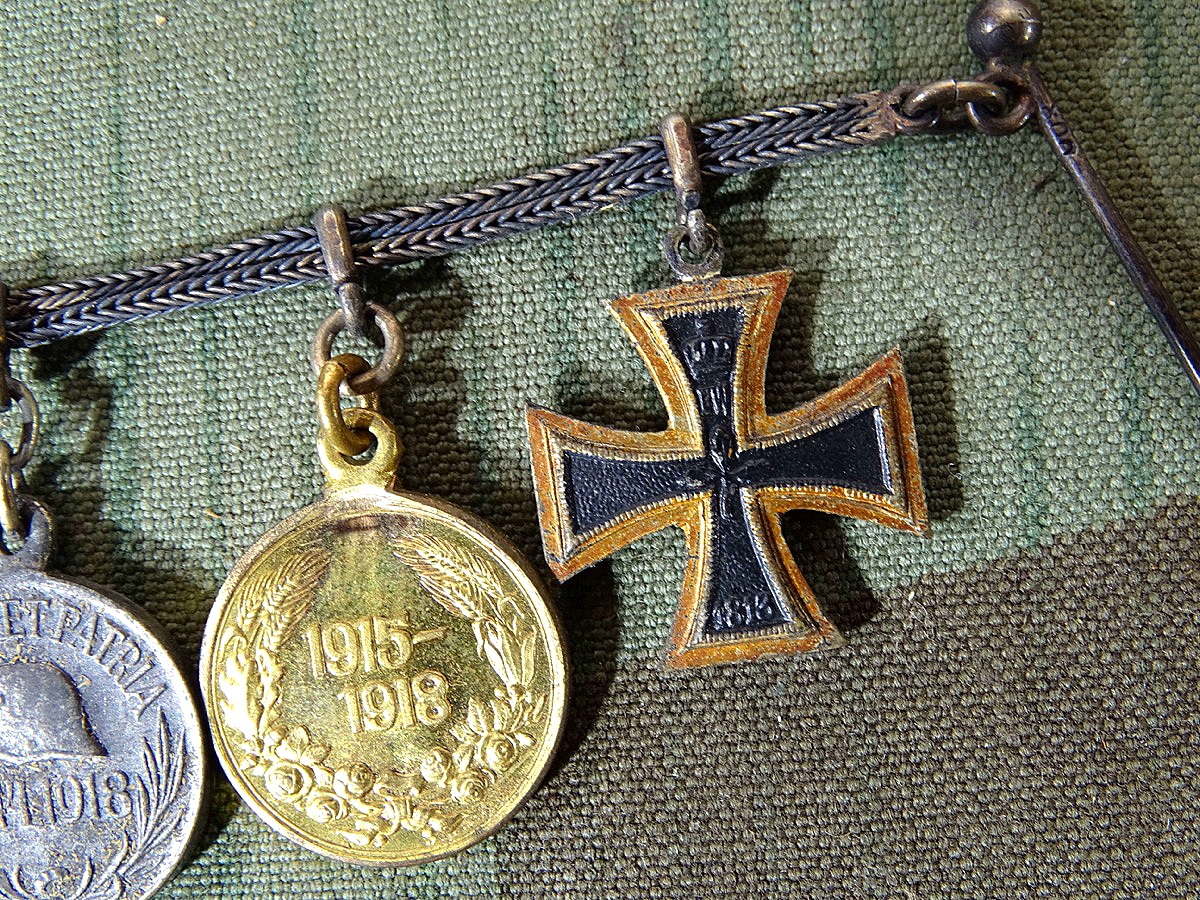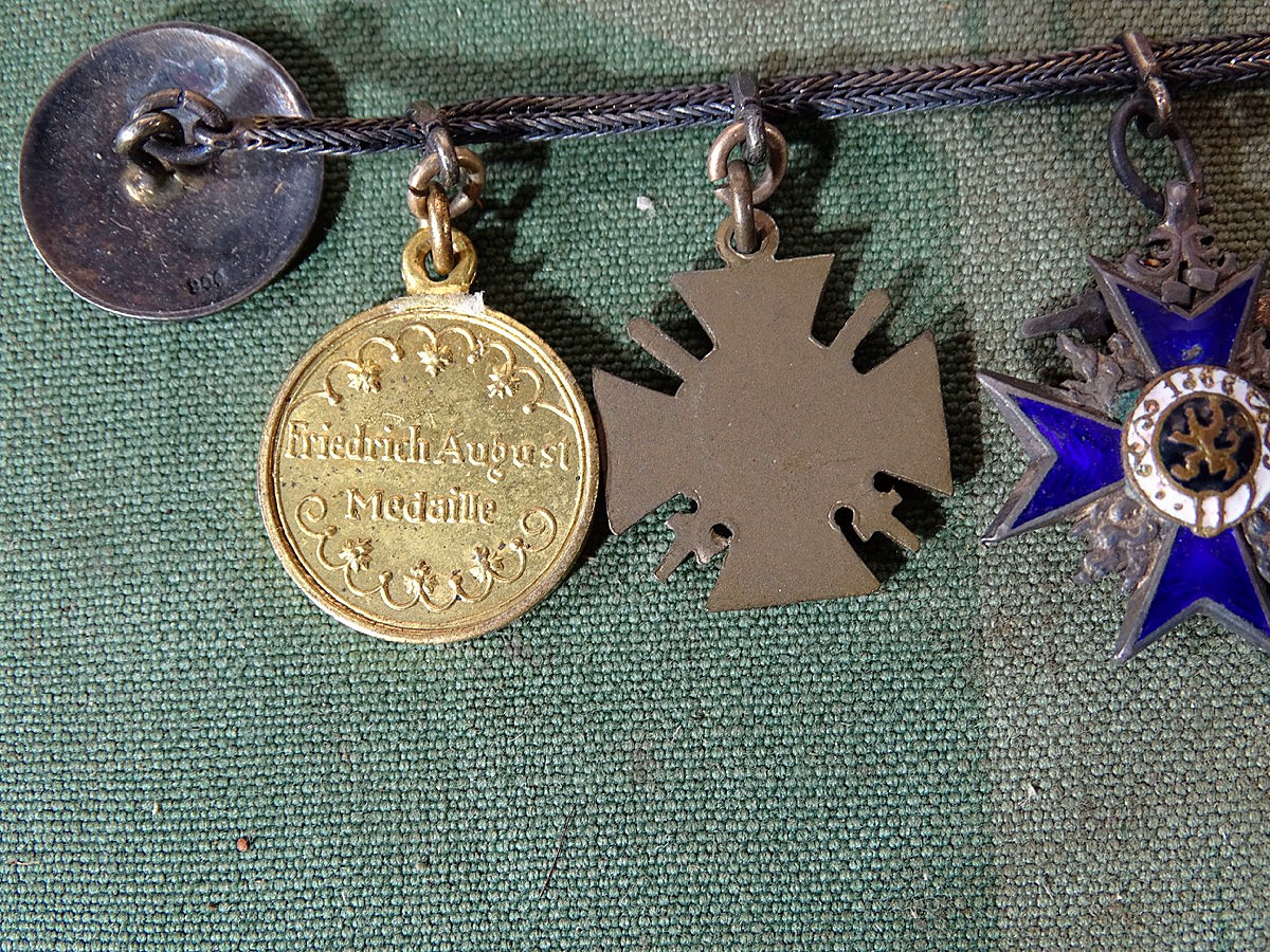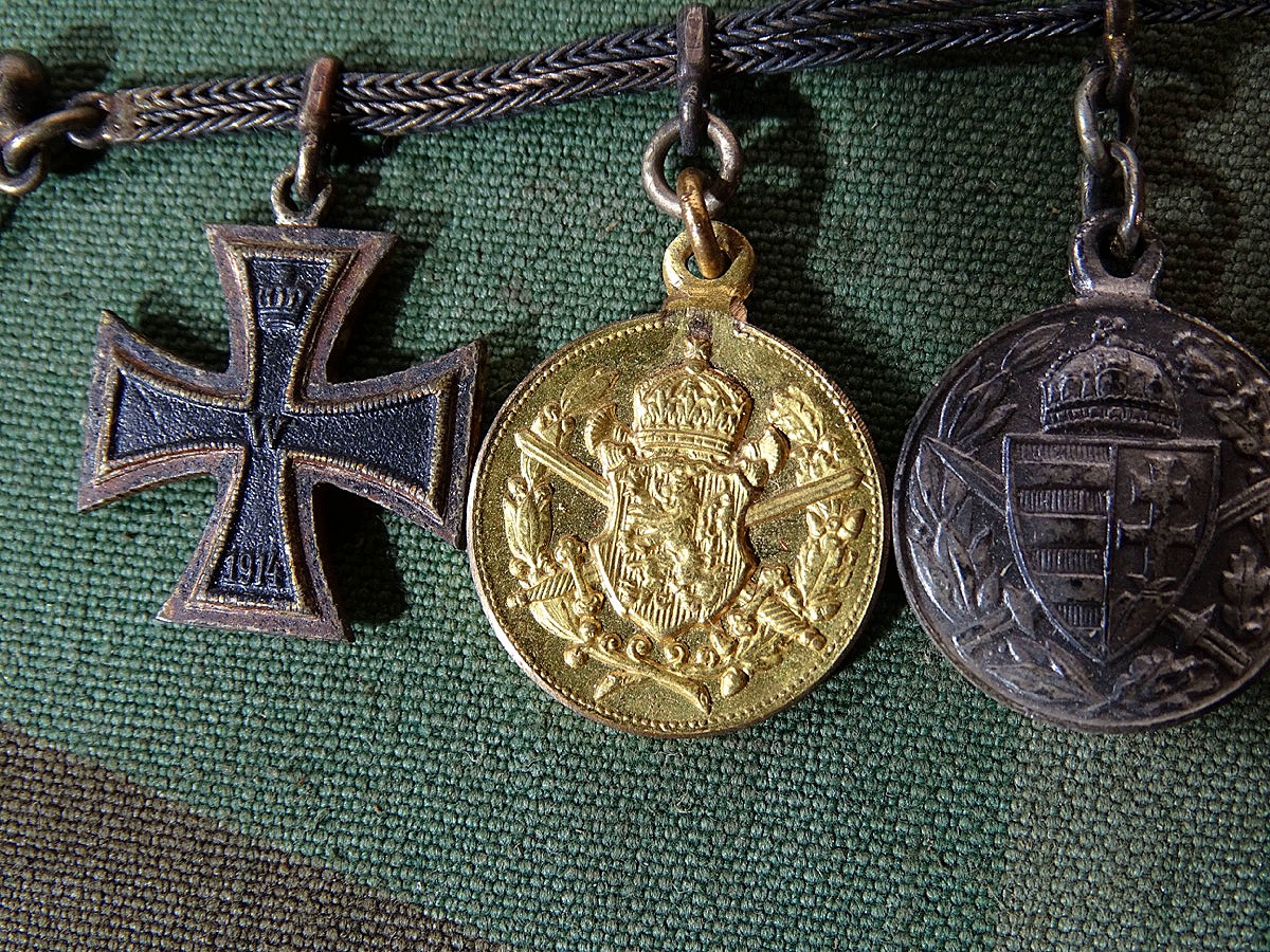 Zustand siehe Fotos, Kettchenknopf mit 900er Silberstempel. Eisernes Kreuz 2 Klasse 1914, Österreich-Bulgarische Kriegsdenkmünze 1915-1918, Österreich-Ungarische Militärverdienst Medaille 1914-1918" "Pro Deo et Partia" , BAYERN - MILITÄR-VERDIENSTORDEN 4.KLASSE MIT SCHWERTERN, Ehrenkreuz für Frontkämpfer 1914-18, Friedrich August Medaille