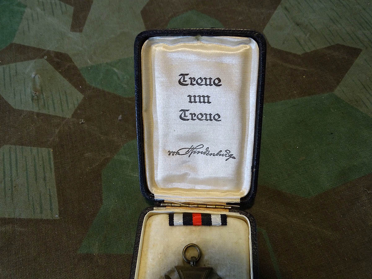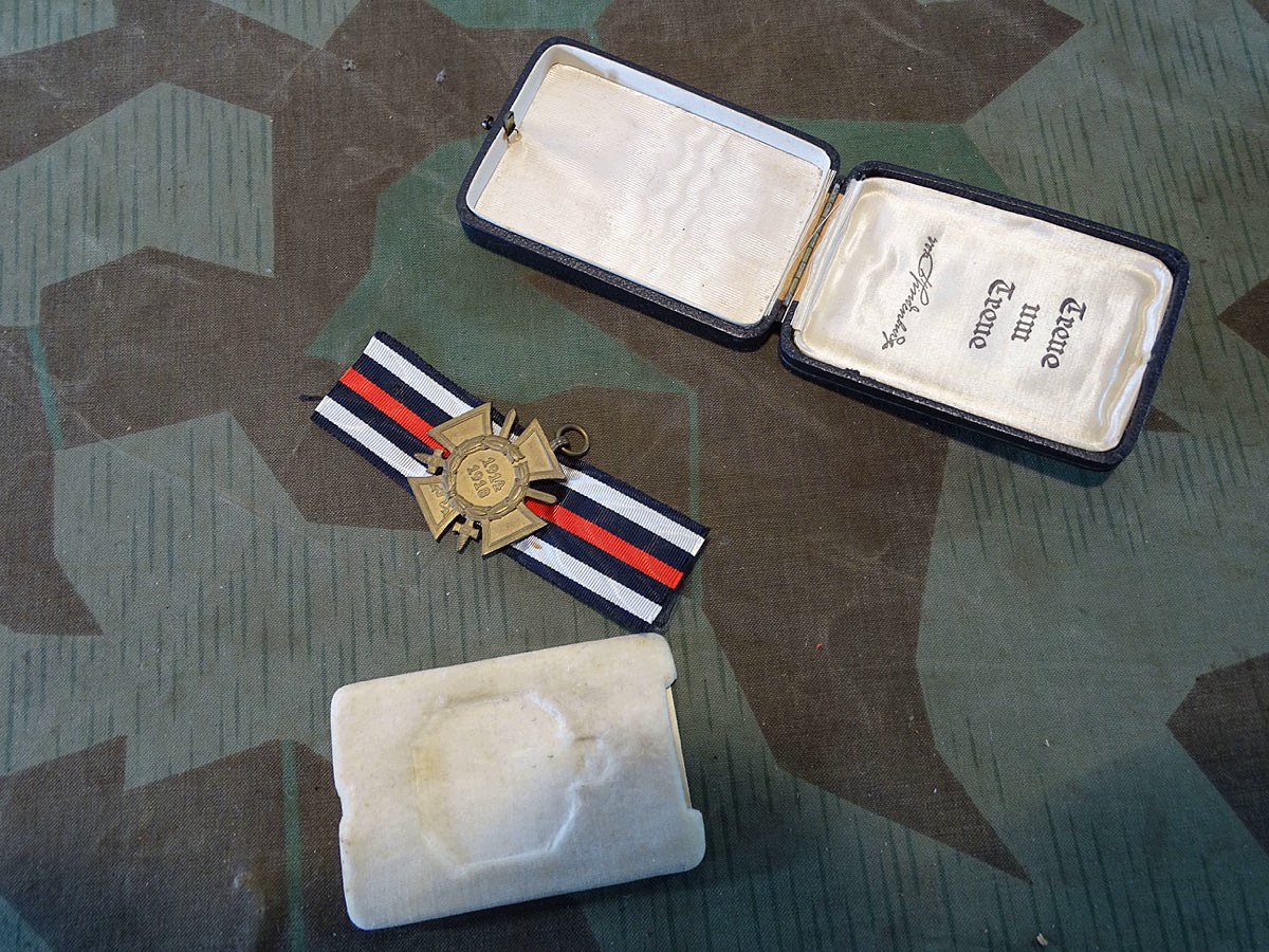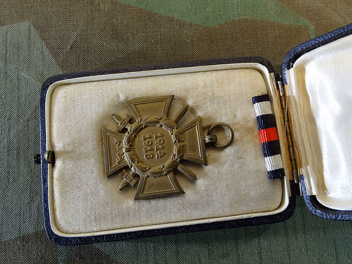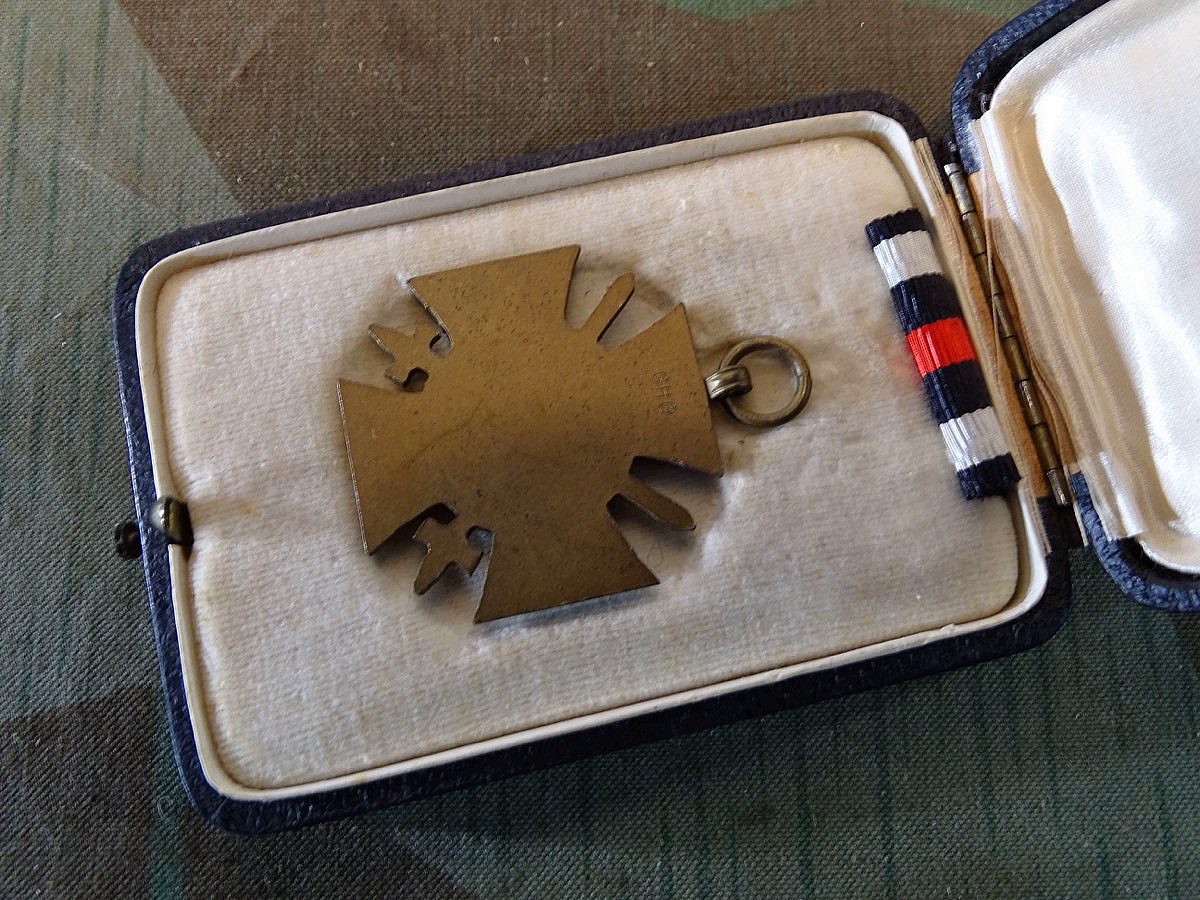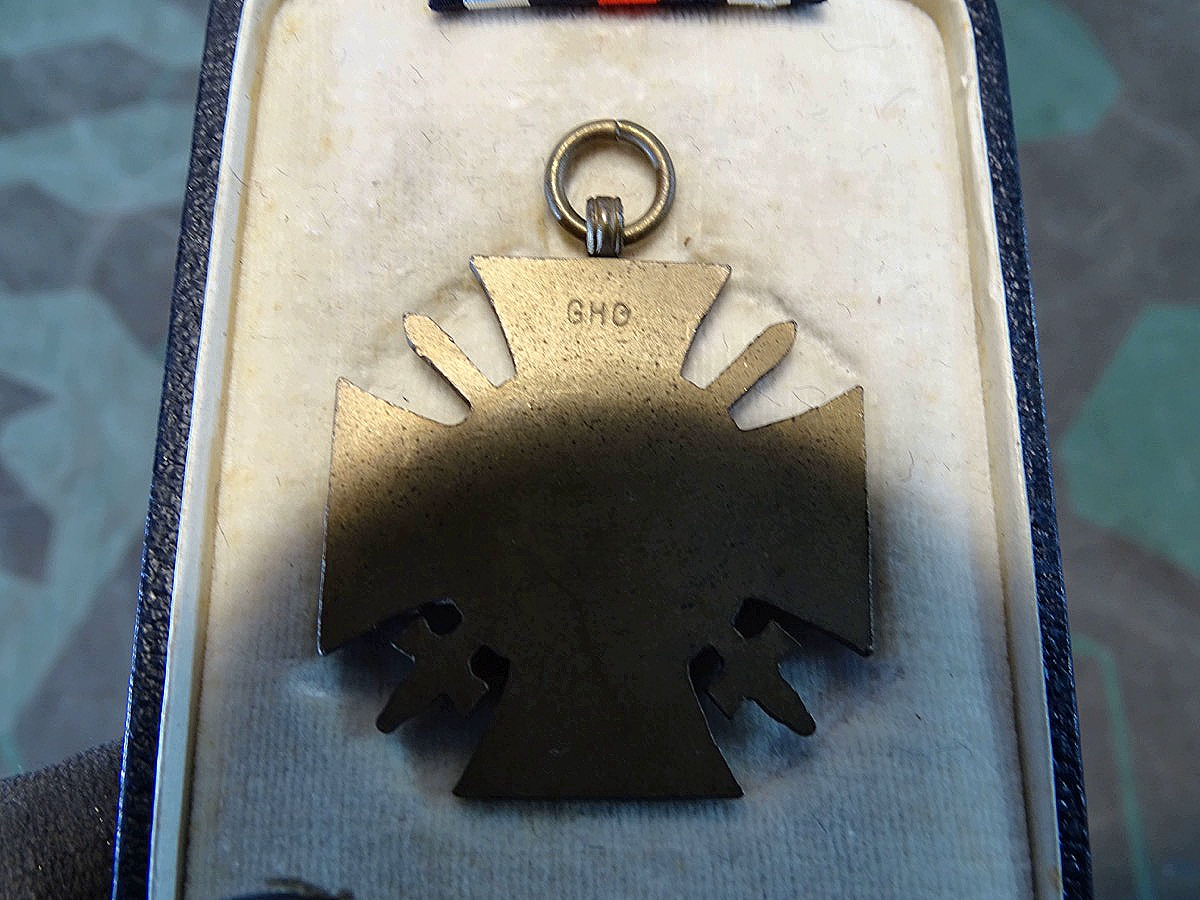 Kreuz mit Hersteller GHO, G.H.Osang Dresden im Etui zum Ehrenkreuz für Frontkämpfer mit Schwertern 1914-1918, mit eingelegtem Bandabschnitt , sehr guter Zustand. Kreuz mit Hersteller GHG