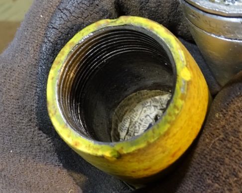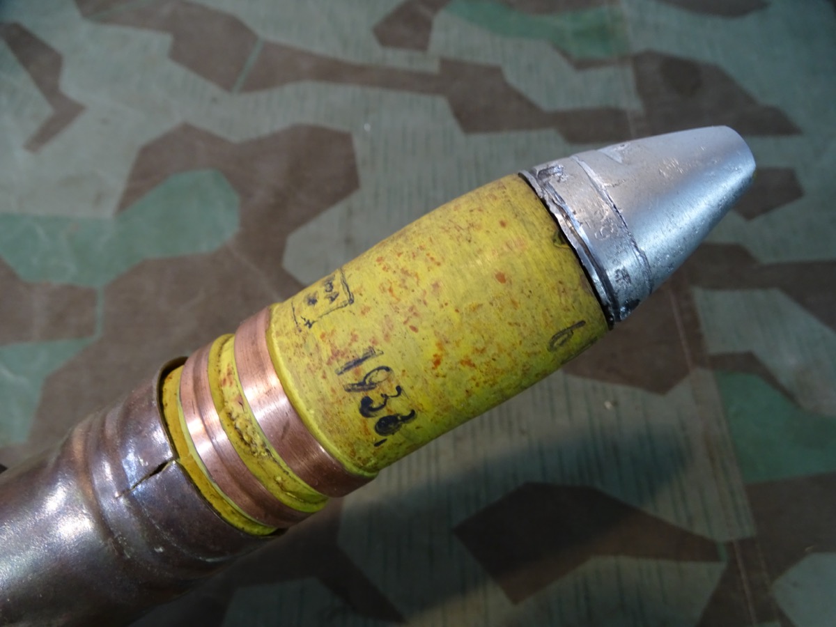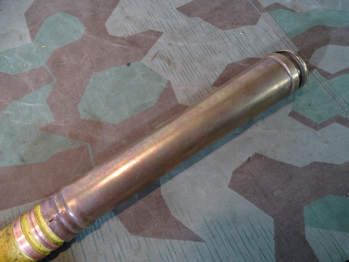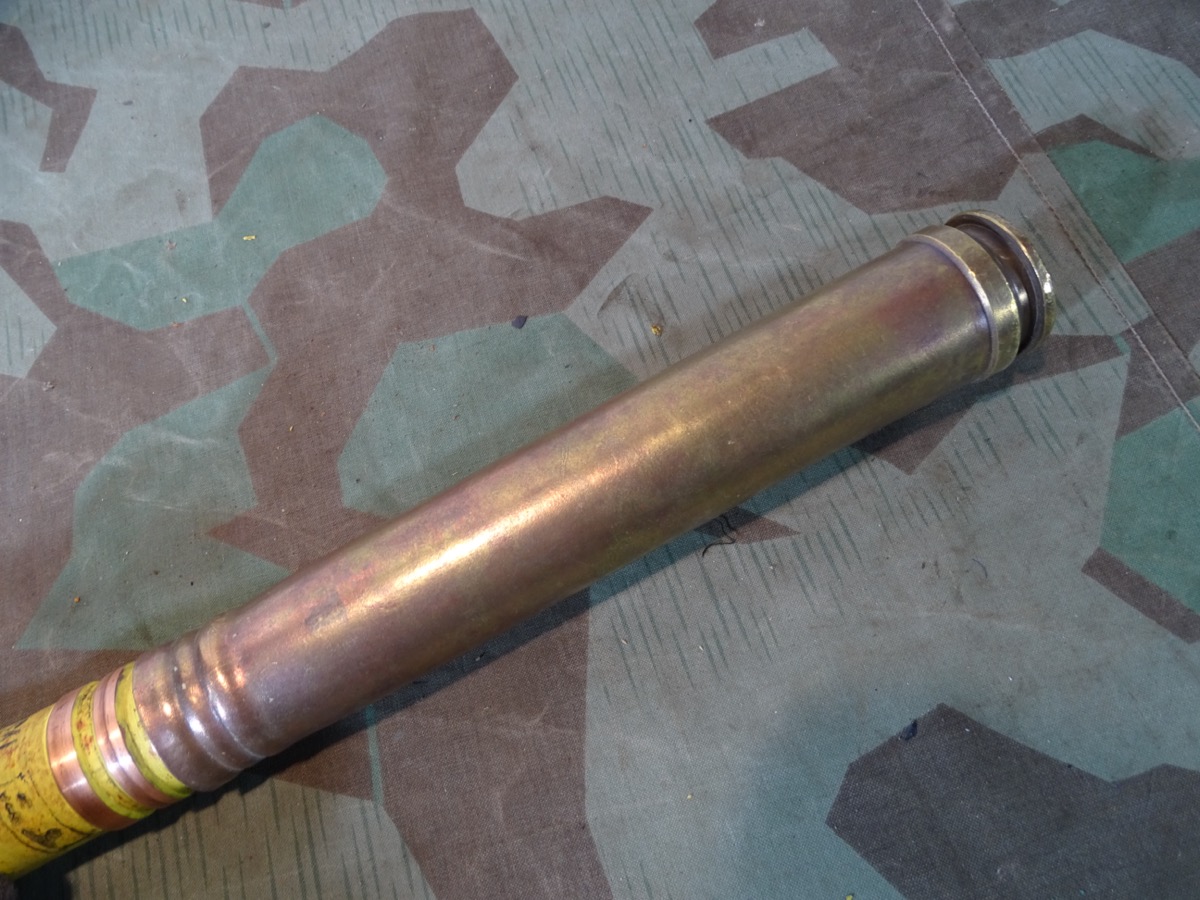 Geschoss genau passend zu Hülse mit 2 dicken, frühen Kupfer Führungsringen. Im Geschoss noch in Teilen die Papierummantlung der Sprengstoffladung erhalten. Beide Gewinde gut erhalten, sauber und gängig. Stammt aus der Auflösung eines Museum in den Ardennen. Geschoss von den Museumsrestauratoren professionell und farblich stimmig restauriert / neu lackiert und gealtert. Schön gemacht. Für Geschoss Unterseite die einschraubbare Leuchtspurhülse mit dabei, ungereinigt.