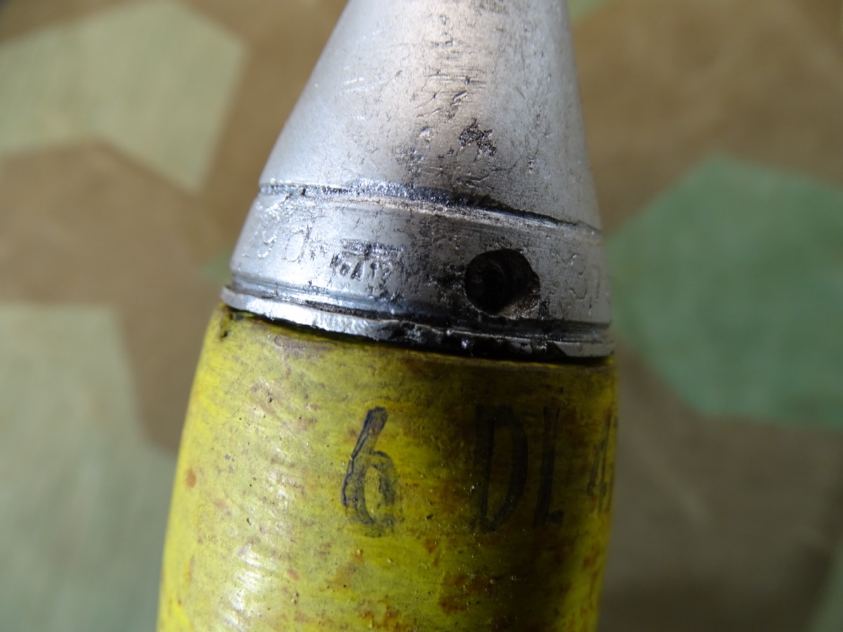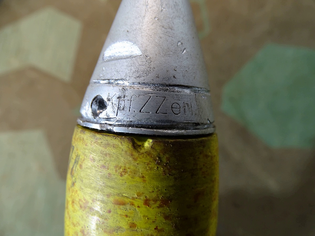 Aluzünder. Beschriftung des Zünders außen noch lesbar.3,7 cm Kpf Z Zerl. WaA Stempel, Der Zünder wurde mal dünn silbern überlackiert, wahrscheinlich als Korrosionsschutz bei der Restaurierung. Die Patrone ist Komplett leer, ohne brennbare oder explosive Stoffe. Bei Bestellung bitte Altersnachweis senden oder mailen ( Kopie vom Personalausweis)