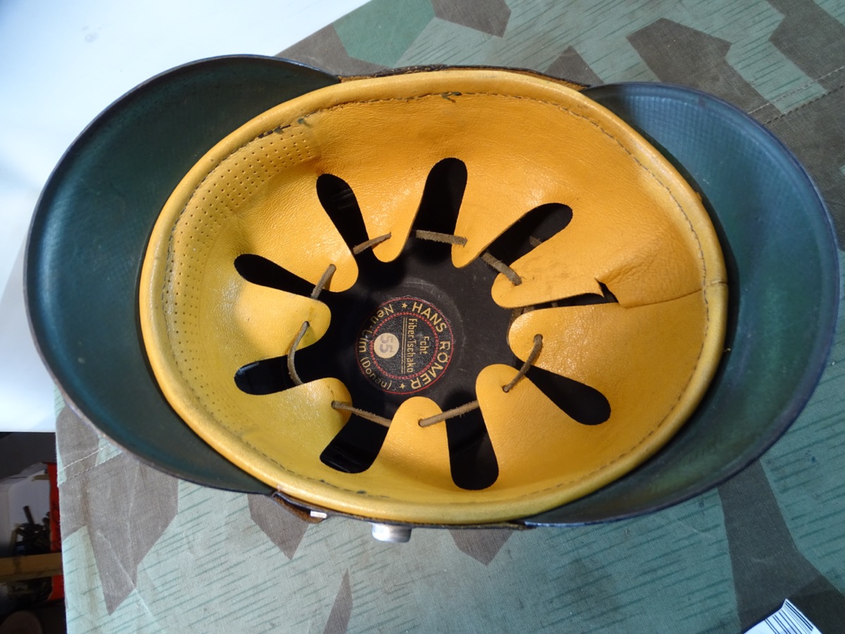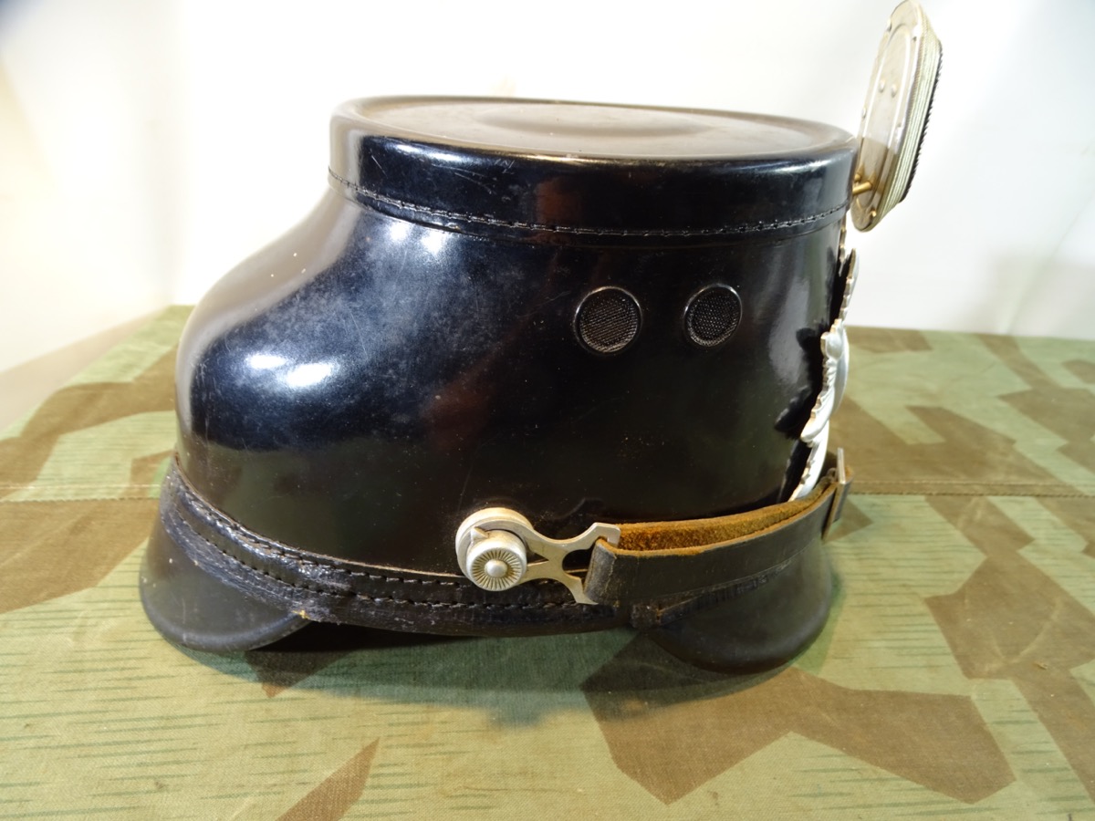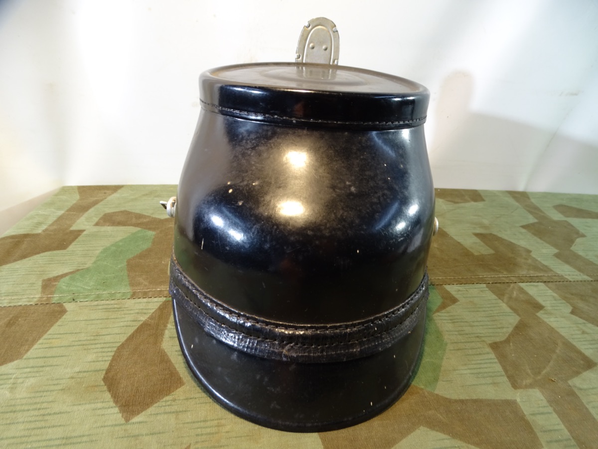 Tschako der 40er / 50er Jahre , Bundesrepublik Deutschland Nordrhein-Westfalen. Kann von der Machart auch ein weiter getragener Tschako der kasernierten Polizei aus dem 3 Reich mit ergänzten NRW Emblemen sein. Komplett mit Leder Kinnriemen und Beschlägen. Lederfutter. Innen schöne Herstellermarke:"Hans Römer Neu Ulm/Donau -Echt Fiber Tschako"
