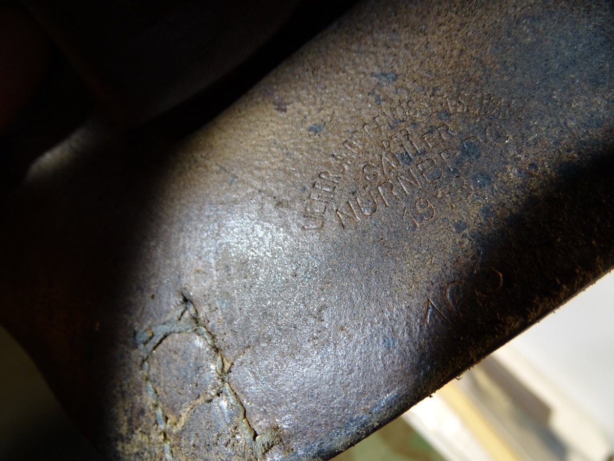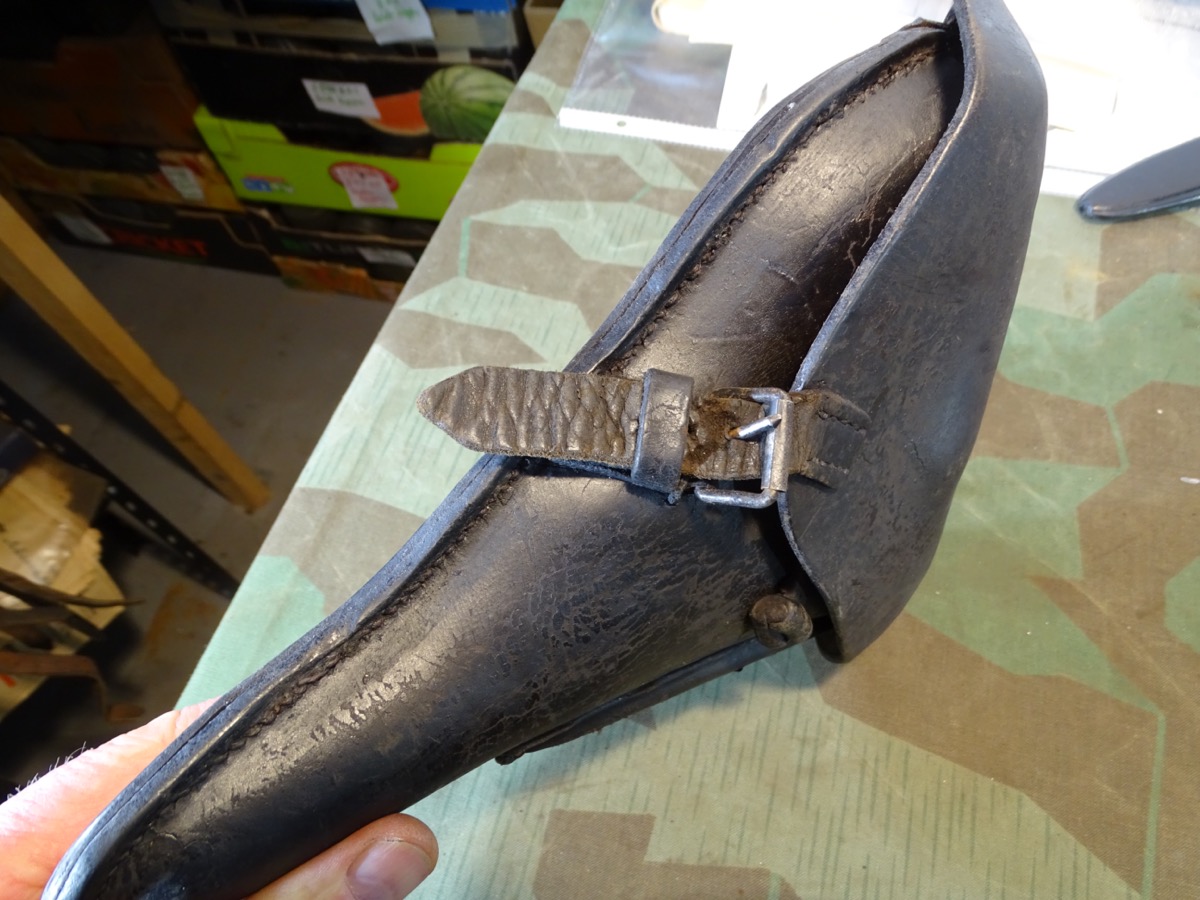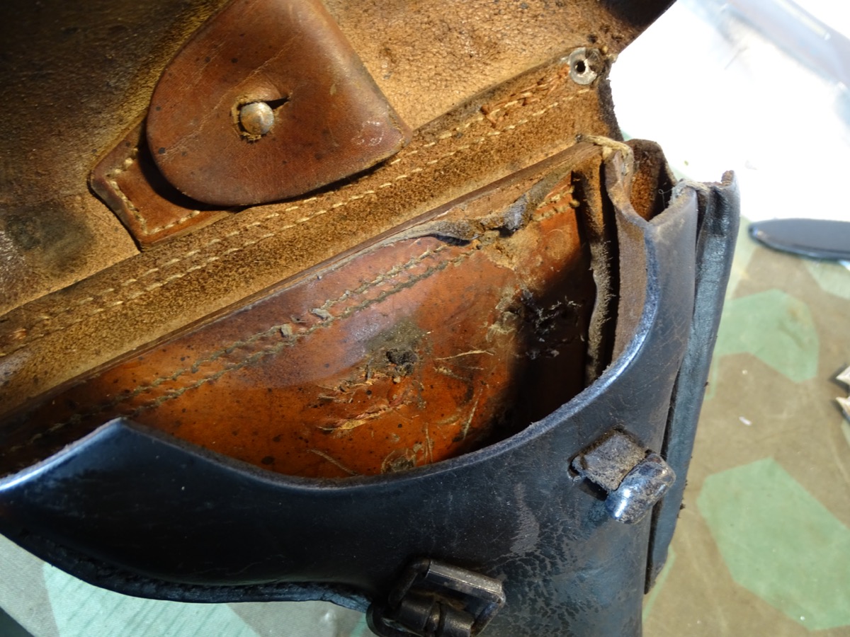 Leder gut erhalten,etwas trocken. Im Deckelrand mit Herstellerstempel: "Liefergenossenschaft der Sattler Nürnberg 1918". Zugband erhalten und funktionsfähig. Im Deckel mit Tasche für Spezialschlüssel. Gebrauchsspuren, kleine unauffällige Reparaturstelle auf der Rückseite. Gürtelschlaufen wohl mal gewechselt.- Zustand siehe Fotos.