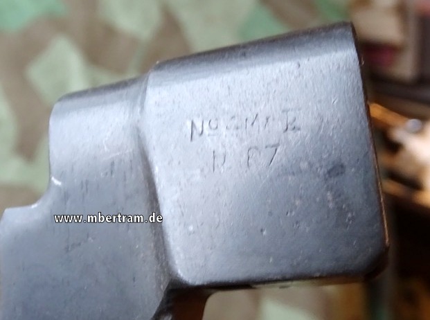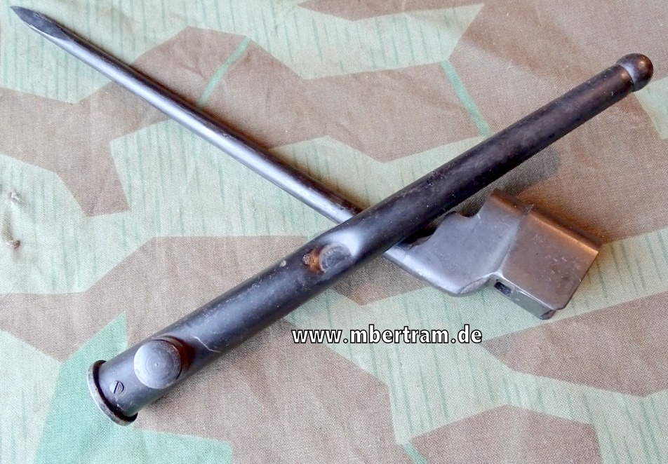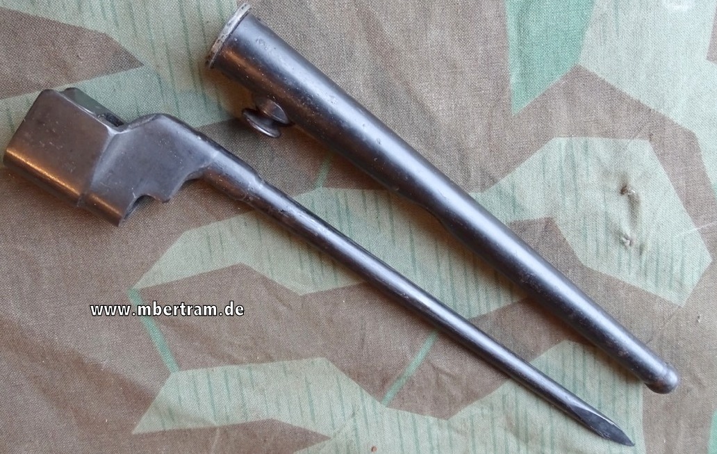Scheide mit Beule, siehe Foto, sonst sehr schön. Länge ca.27,5cm mit Scheide. Am Aufsteckteil mit Stemplung des War departement Pfeils und der Modellbezeichnung No 4 MK 2. Modeleinführung in 1941, Verwendung dieses Typs bis ca. 1957, wurden hergestellt von Singer und einigen anderen Herstellern in UK, sowie Savageund Long Branch in North America. Sie wurden verwendet mit der No 4 MK2 SMLE Enfield Rifle und der Sten Mark V MP. Bei Bestellung bitte Altersnachweis mailen oder schicken ( Kopie / Foto vom gültigen Personalausweis).