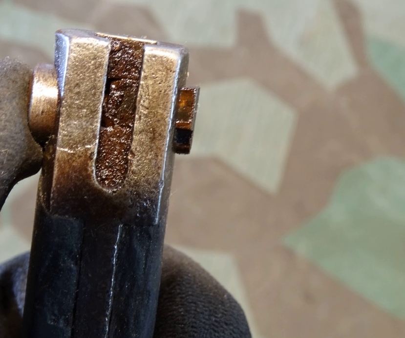 Altersgemäße Gebrauchsspuren. Auf Klingenrücken mit Waffennummer, daneben steht noch etwas, niocht klar zu lesen, könnte der Hersteller Castelli sein. Die Klinge und derr Griff sind Originalbrüniert, die Scheide wurde mal im Laufe der Nutzung sauber schwarz lackiert. Der Drücker funktioniert. Selten im Handel. Zustand siehe Fotos. Bei Bestellung bitte Altersnachweis mitsenden (Kopie vom Personalausweis).