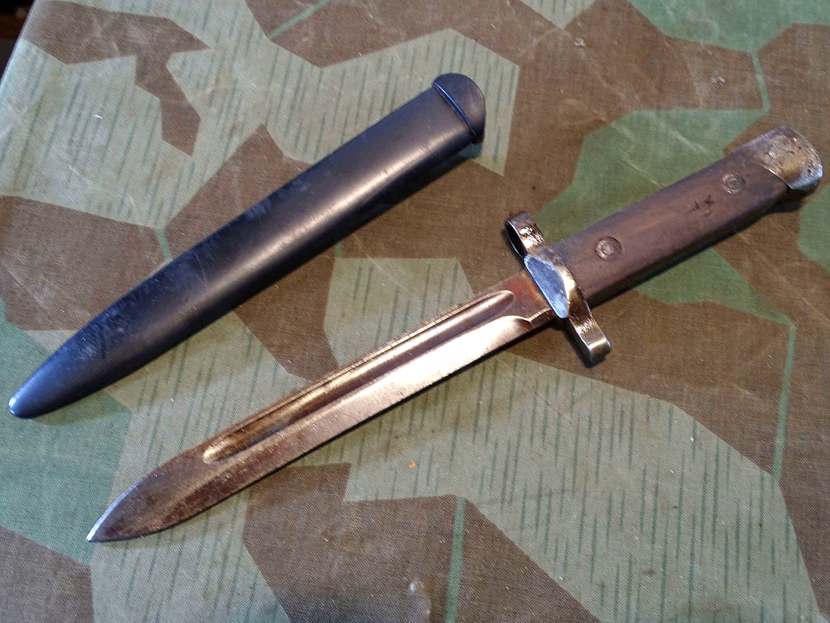 Das 3. Modell für den Mannlicher-Carcano M 1891/38. Nachdem vorher ein Klappbajonett eingeführt wurde, das nicht stabil genug war, führte man als Nachfolgemodell diese Version ein. Ein neuer Typ mit nicht klappbarer Klinge und einer verbreiterten Parierstange.
