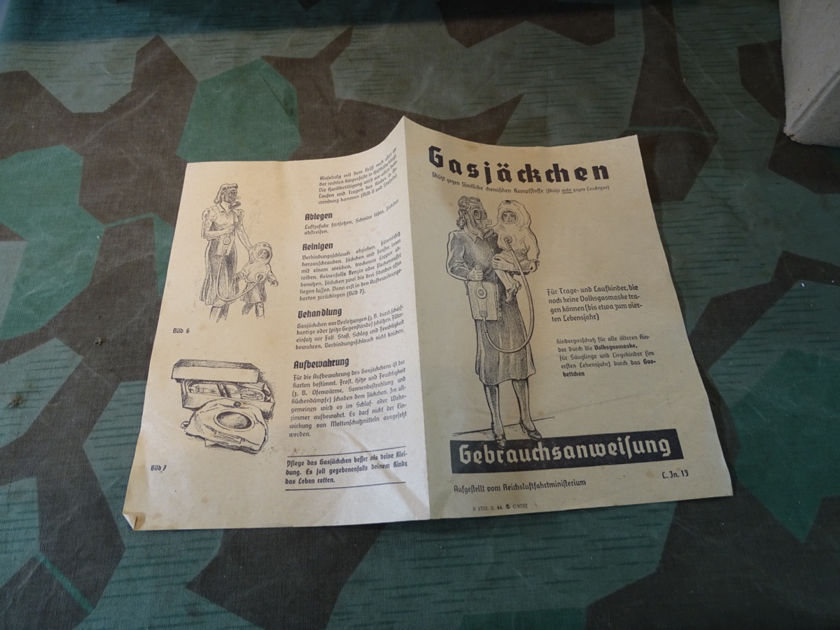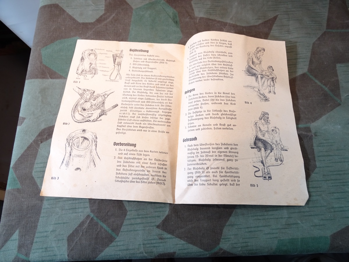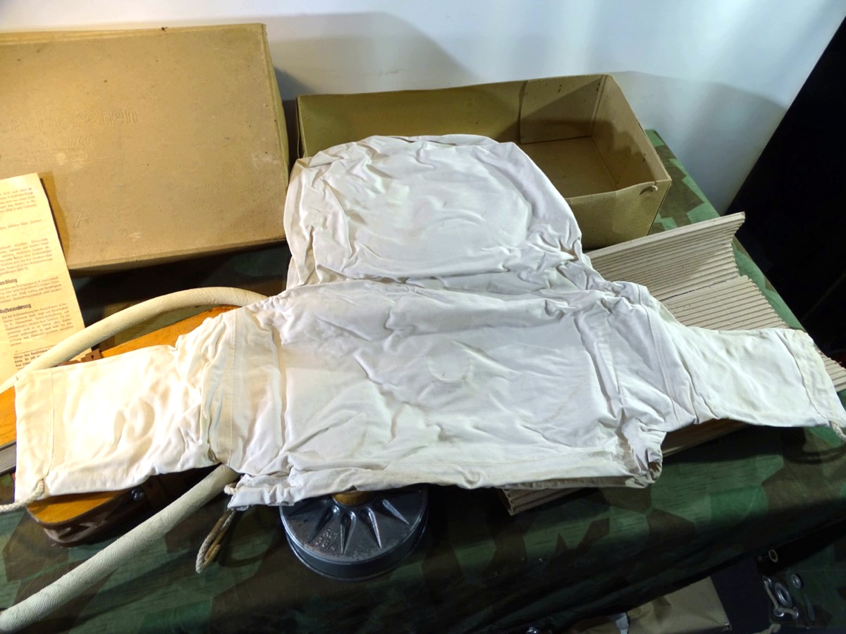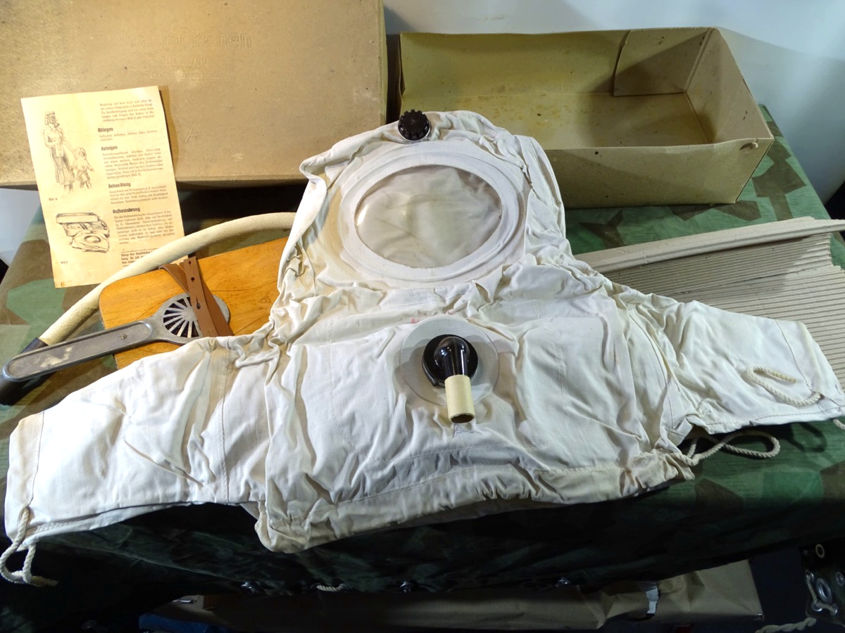 mit Jäckchen, mit Anleitung, mit Filter im Filter- Karton, mit Blasebalg und Schlauch. Sopgar noch mit Papp Abdeckung für Ventil und Filter. Alters- u. Gebrauchsspuren. Karton mit Prägung: " Gasjäckchen " Auf Jacke mit Beschriftungen. Funktion des Blasebalgs nicht geprüft, so verschnürt gelassen wie er war. Man sieht seitlich, dass der Ersatzstoff Bezug durch Alterung nicht mehr sehr stabil und teils gebrochen ist. Schön erhaltene Jacke. Siehe Fotos- . Selten so komplett zu bekommen.