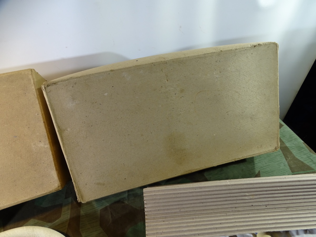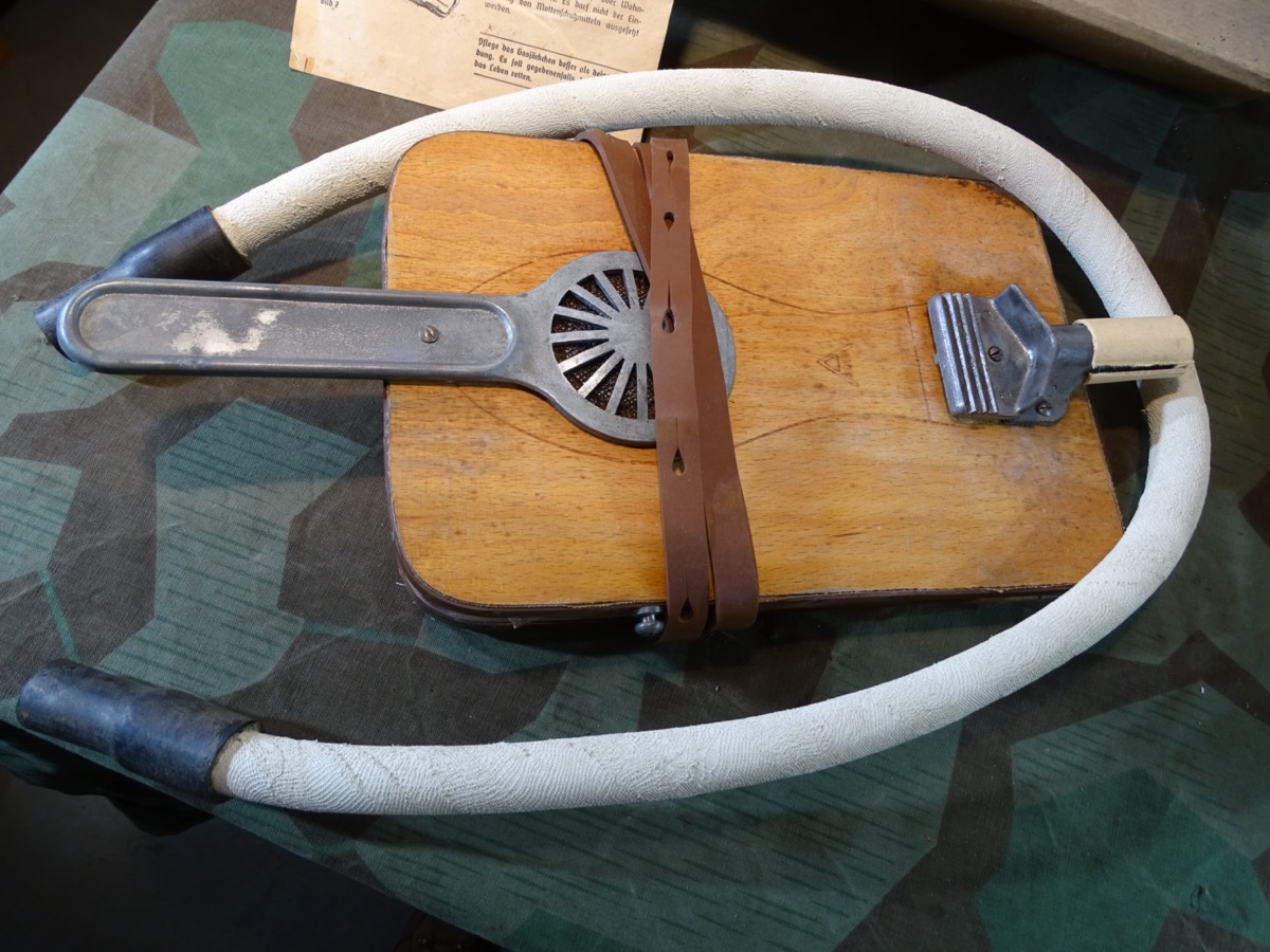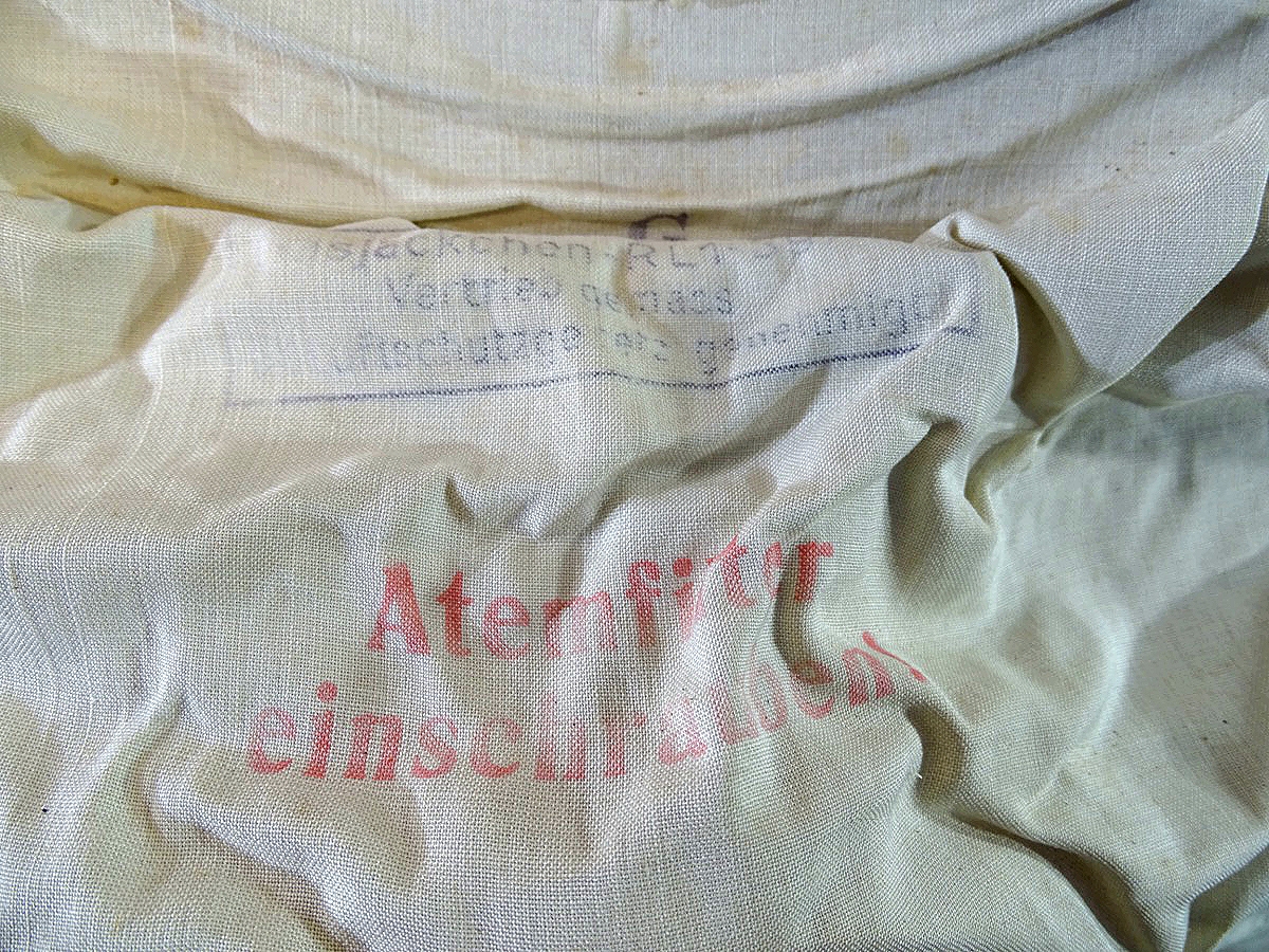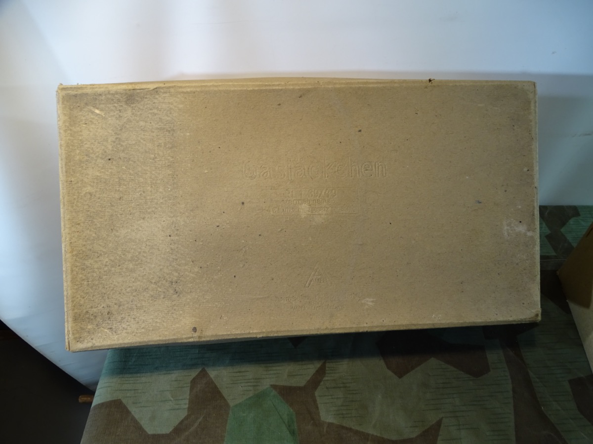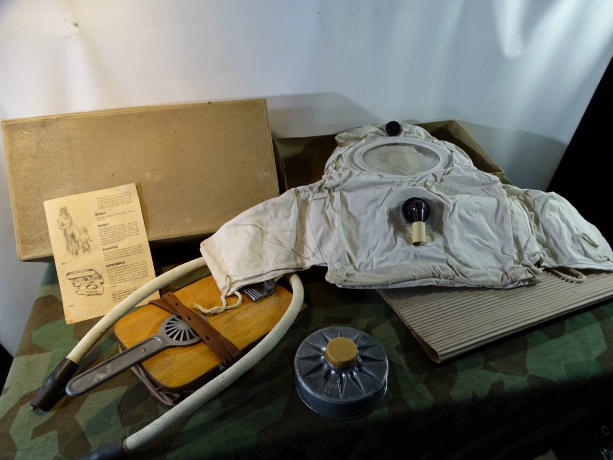 mit Jäckchen, mit Anleitung, mit Filter im Filter- Karton, mit Blasebalg und Schlauch. Sopgar noch mit Papp Abdeckung für Ventil und Filter. Alters- u. Gebrauchsspuren. Karton mit Prägung: " Gasjäckchen " Auf Jacke mit Beschriftungen. Funktion des Blasebalgs nicht geprüft, so verschnürt gelassen wie er war. Man sieht seitlich, dass der Ersatzstoff Bezug durch Alterung nicht mehr sehr stabil und teils gebrochen ist. Schön erhaltene Jacke. Siehe Fotos- . Selten so komplett zu bekommen.