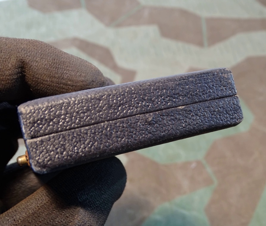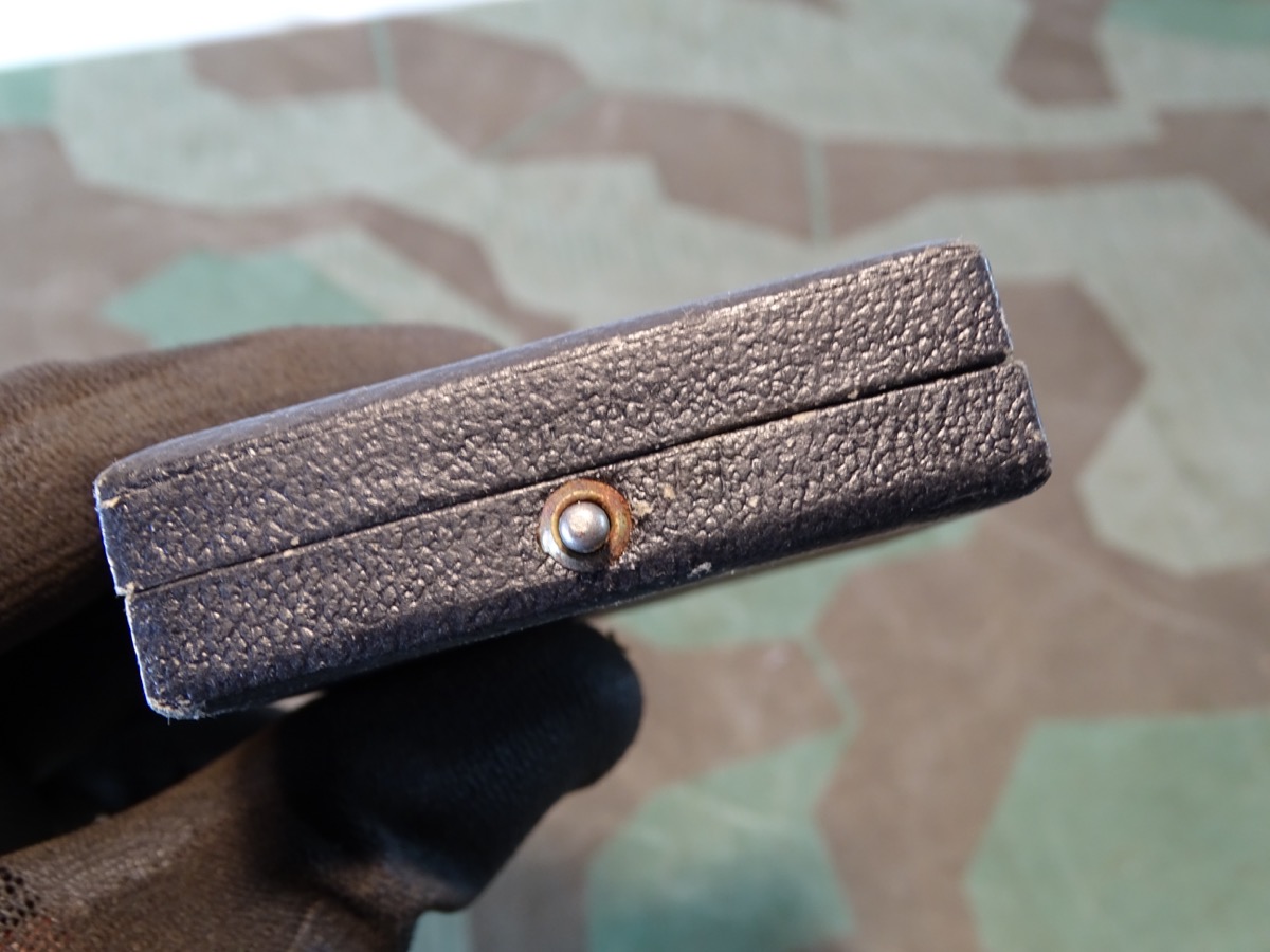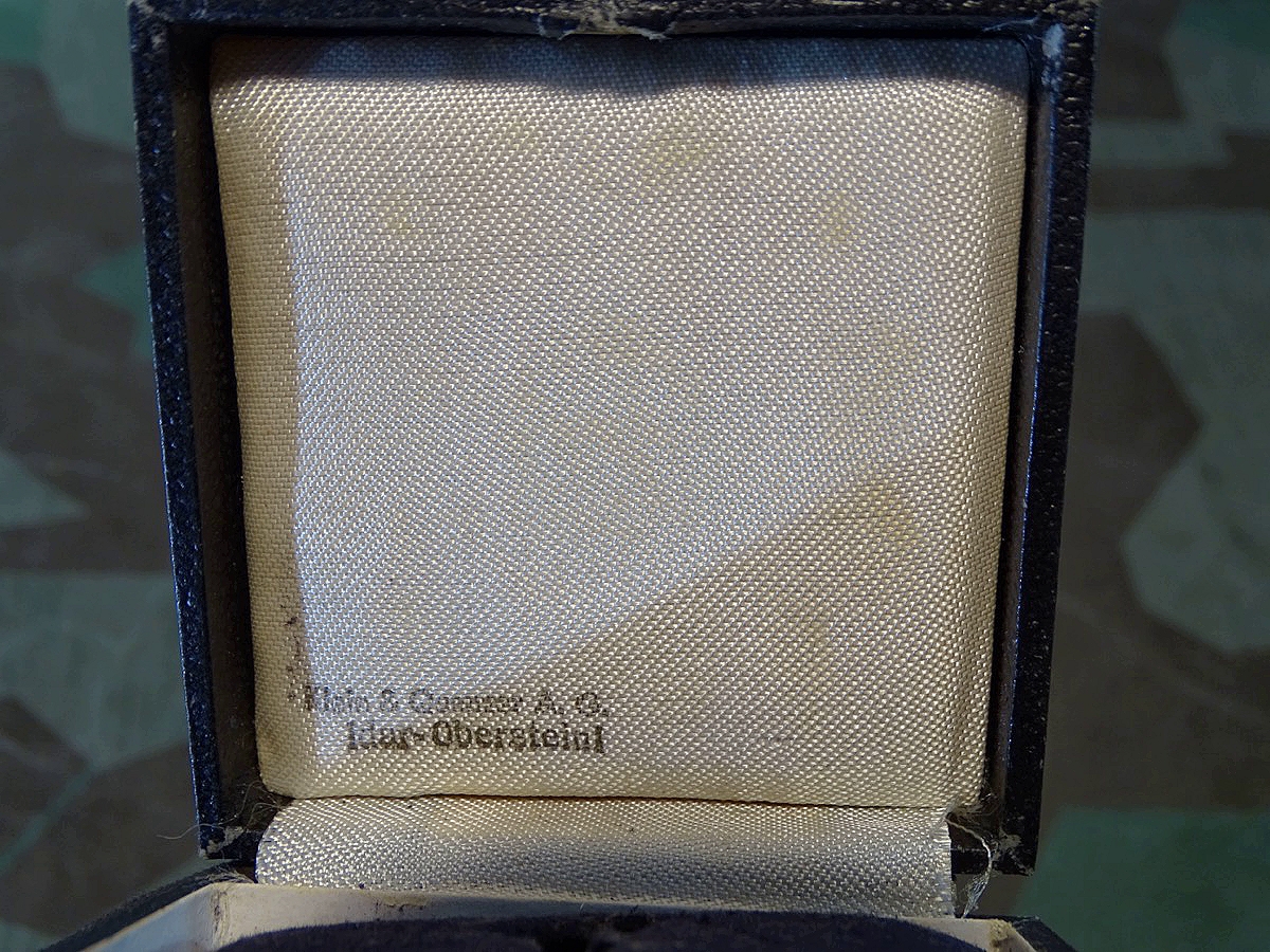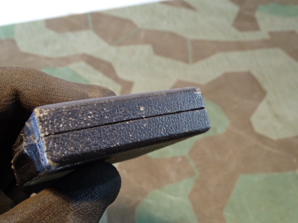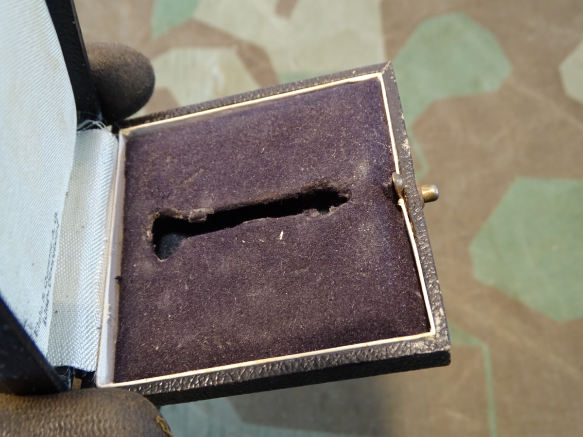 Zustand siehe Fotos. Schöner, normal bis leicht gebrauchter Zustand. Auf den Deckel mit in Silber eingeprägter Abbildung der Auszeichnung mit Hakenkreuz(!). Im Deckel der Herstelleraufdruck "Klein & Quenzer A.G. Idar - Oberstein . Passend für alle Kreuze des Herstellers Klein & Quenzer (65). Sehr seltenes Etui, in guter Erhaltung!