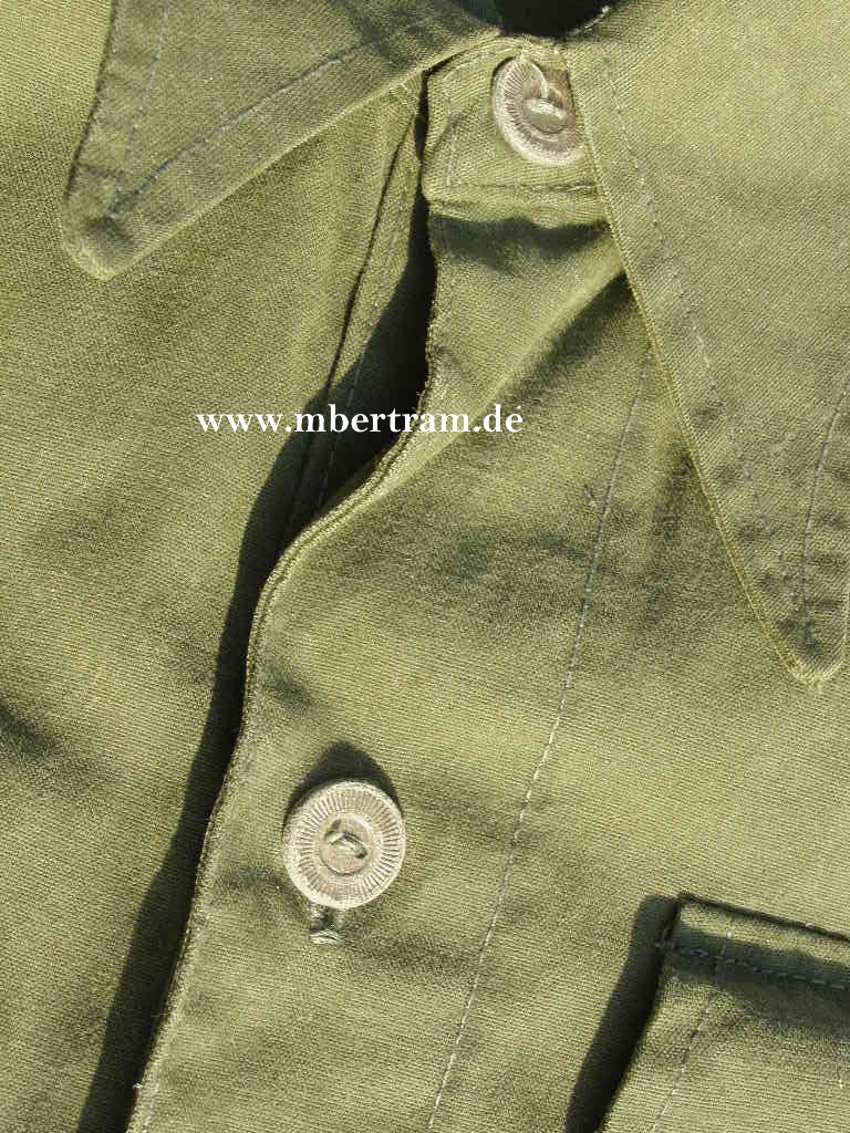 schön erhalten, sehr selten. Brustschlitz, Kragen u. Brusttaschen, glatter Stoff, typische Pappknöpfe Typischer Schnitt mit halbhoher Knopfleiste. Spätes Modell mit Pappknöpfen. Wird sehr selten im Handel angeboten, da fast alle Hemden aufgetragen wurden. Abmessungen Ärmellänge außen bis Schulternaht ca. 59 cm. Brustbreite unter Achseln gemessen ca. 55cm. Höhe mittlere Frontseite bis Kragen Anfang ca. 76cm.