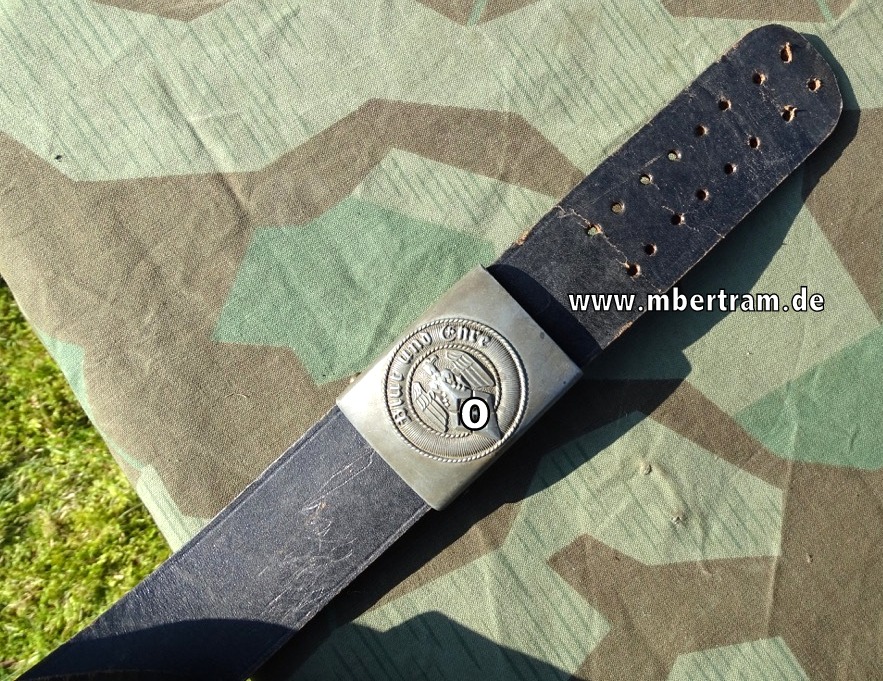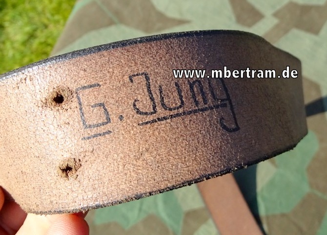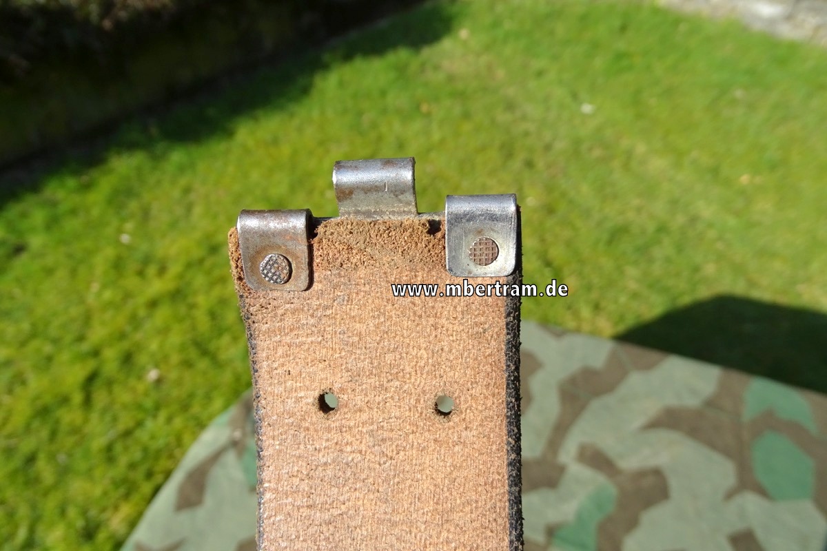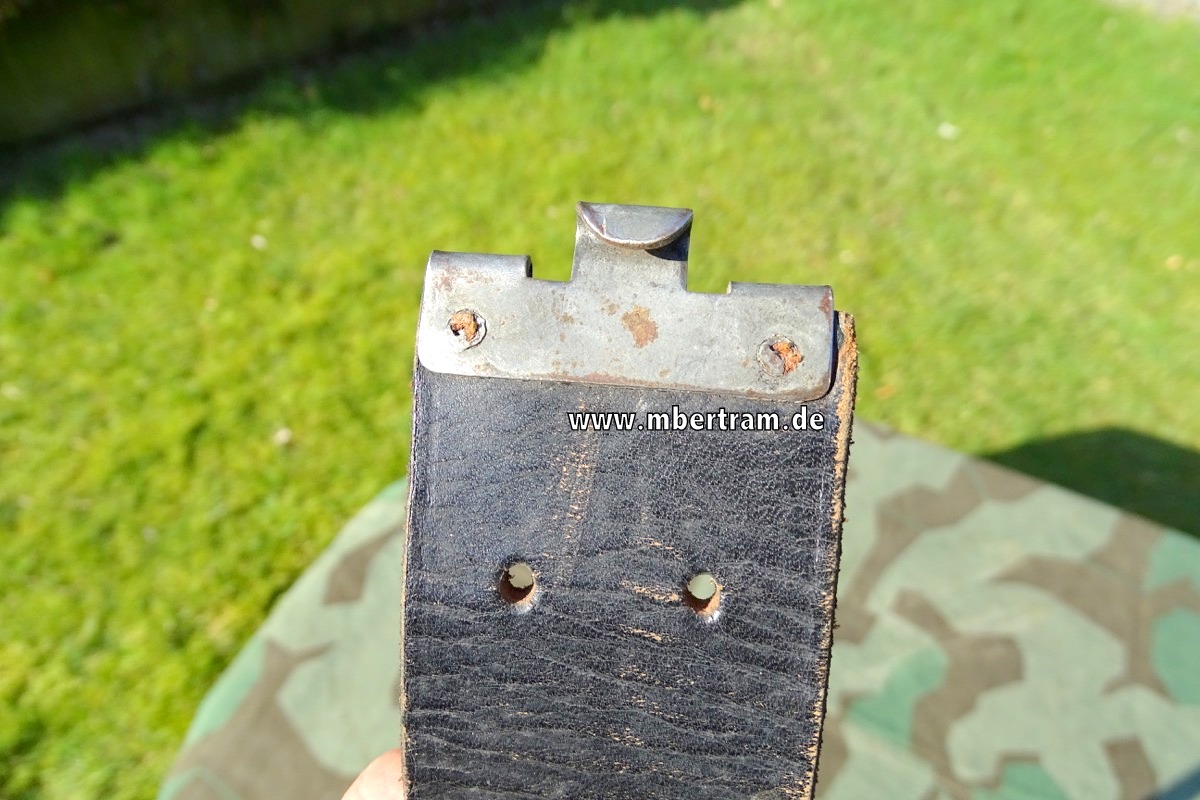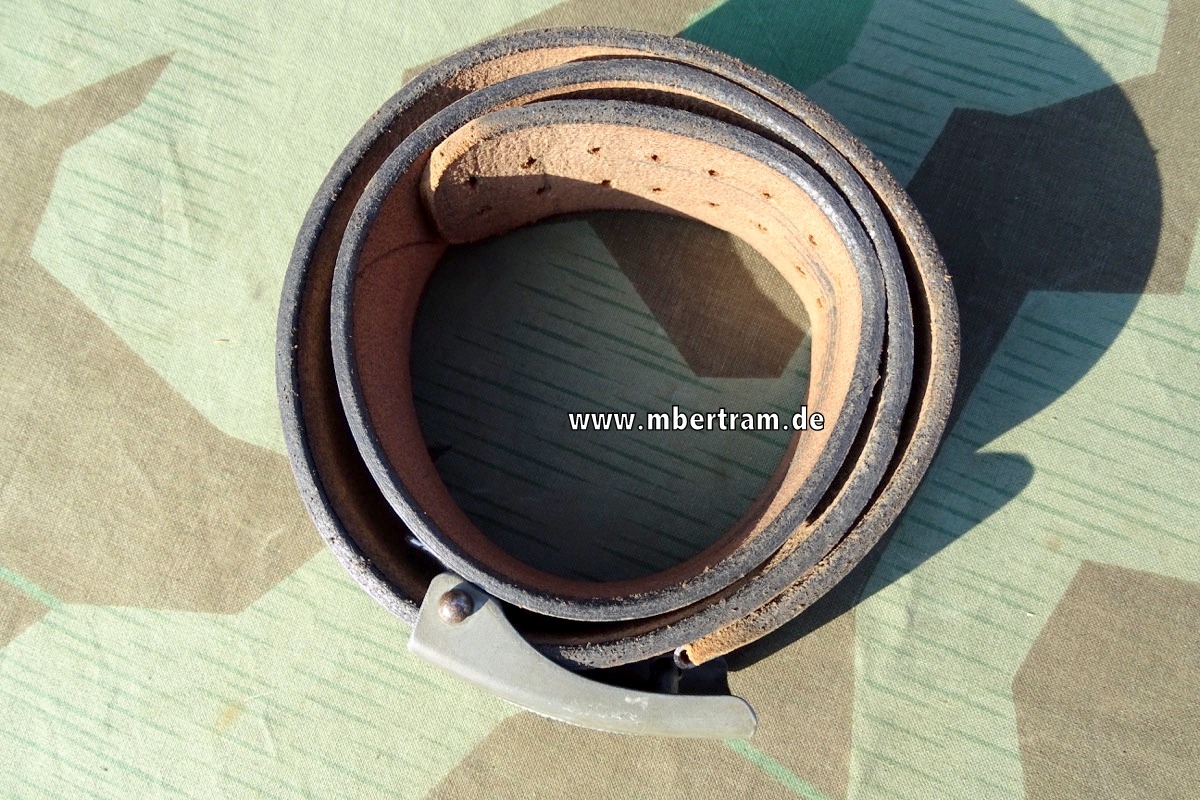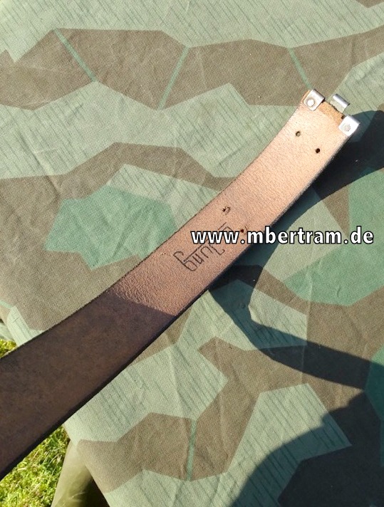 Herstellermarke RZM 4/39 Assmann & Söhne, Lüdenscheid. Zugehöriger später schwarzer Leder Koppel in guter Erhaltung. Beides aus privatem Trägernachlass angekauft. Späte, vereinfachte Form mit direkter Lochung im Koppel, ohne Lochlasche. An beiden Enden etwas gekürzt, und ein paar zusätzliche Lochungen. Träger hat wohl wie so oft im Krieg deutlich abgenommen. Leder noch biegsam und geschmeidig. Innen mit Trägersignatur. Koppellänge nur ca. 88 cm wie für HJ Riemen typisch