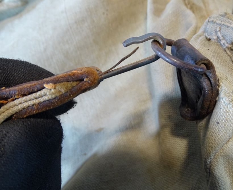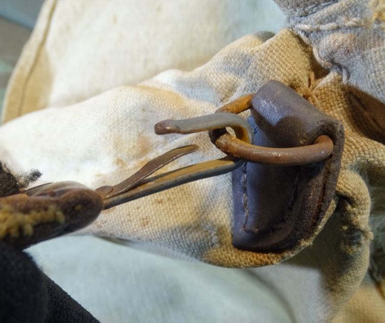 Brotbeutel 1. Weltkrieg, späte Ausführung mit entferntem Koppelhaken und zugehörigem, seltenen Trageriemen. Grober sandbrauner Stoff. Mit Lederbesatz, Eisen D - Ringen. In Deckel mit Kammerstempel: "Beschaffungsamt 4". Alle 3 Leder Schließlaschen vorhanden. Leder relativ trocken. Mittelknopf 4- Loch Zink. Untere Knöpfe eingenietet, Eisen, späte Ausführung.