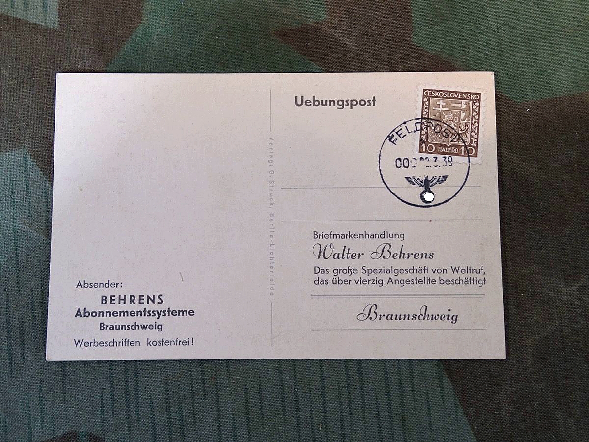 Seltener Druck als Werbungs " Übungspost " einer Briefmarken Handels Firma. Gelaufen als Feldpost 1939 mit ausländischer Briefmarke, Verlag O.Struck, Berlin Lichterfelde. Zustand siehe Fotos
