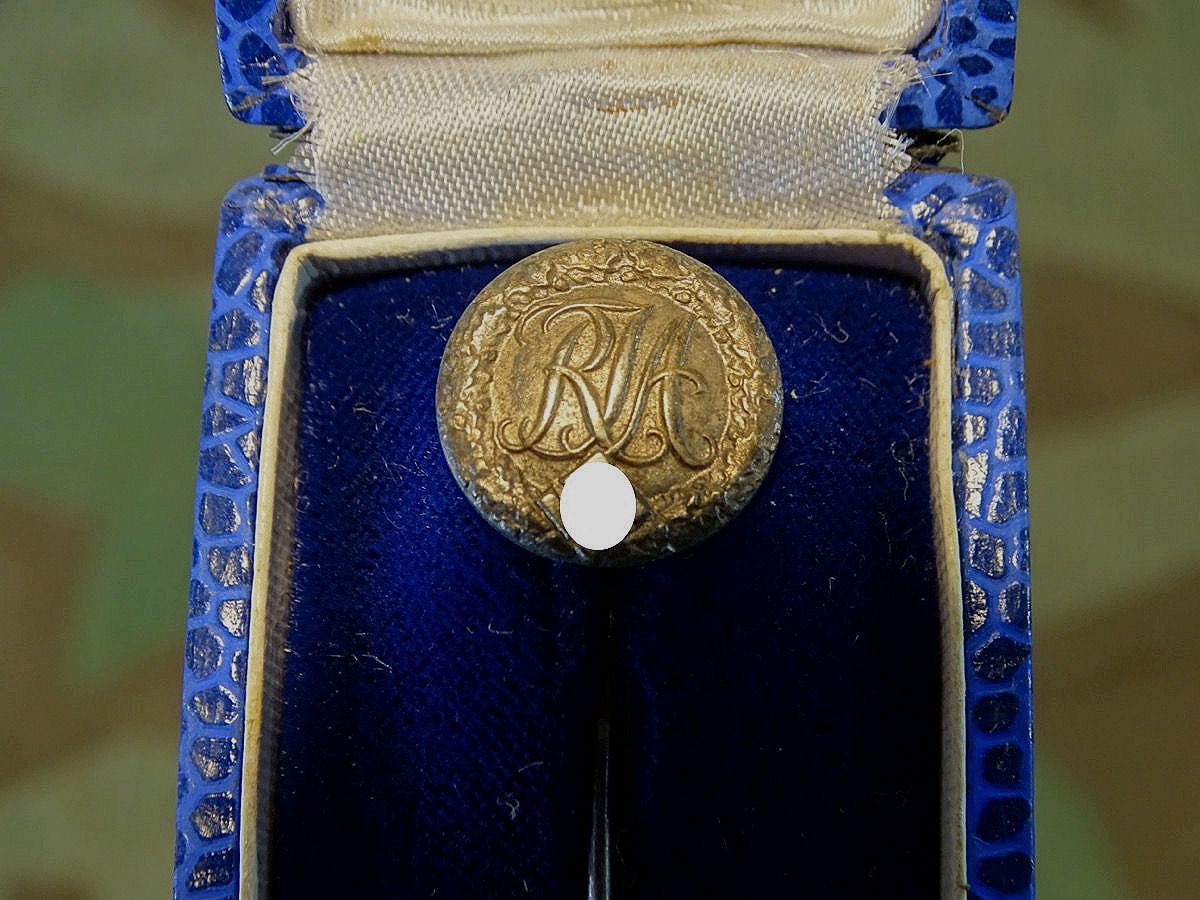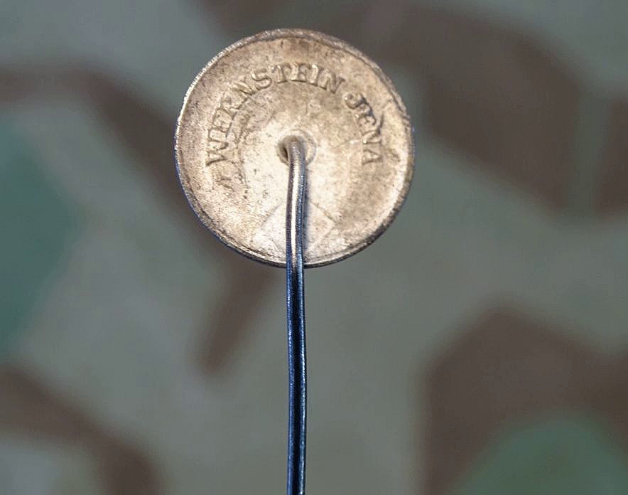 16 mm Abz. an langer Nadel, Rückseitig mit Hersteller Wernstein Jena . Mit altem Aufbewahrungskästchen des Trägers, muss nicht zwingend zugehörig sein. Ob er es auch in dem Kästchen von bekommen hat, konnten wir nicht mehr klären. Unberührt-ungereinigt und so direkt aus Trägernachlass von der Familie angekauft.